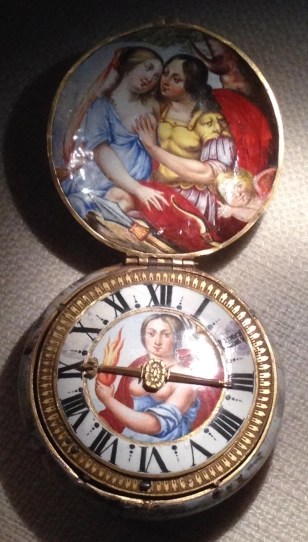 Towards 1630 many cases got intricately enamelled with biblical or mythological scenes. Also the dials got colourful. This style got introduced in France, especially in Paris, Blois and Limoges. Most of the later work from 1660 on was made in Switzerland, Geneva being the most renowned. During the reign of Louis XIV, the watches got round again, and huge. Due to their big size and rounded form they are called ‘ognions’. Their diameter can reach 55mm with a distance between the plates of 17mm. The gilt brass cases are usually engraved, the dials are of enamelled brass with big black or blue roman numerals. Some dials are of gilt brass with enamelled cartouches for the hours. Some watches already bear astronomical information such as day/date, moon phase, astrological signs and even equation of time.
