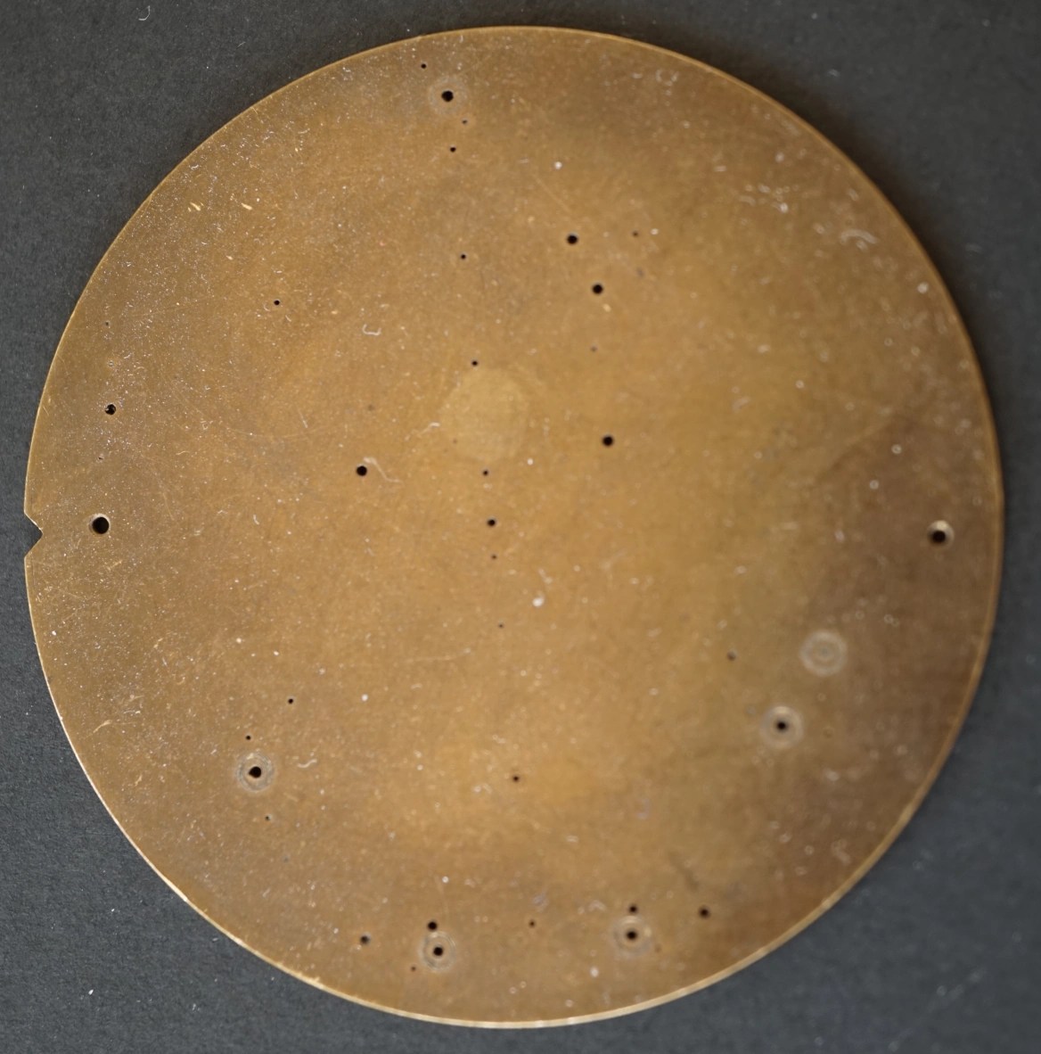 Description: Abandoned brass calibre for a ‘Garde temps’. Only the pivot holes are pierced, no further engravings. Earnshaw chronometer spring detent escapement, double going barrels (wound separately), regulator dial.