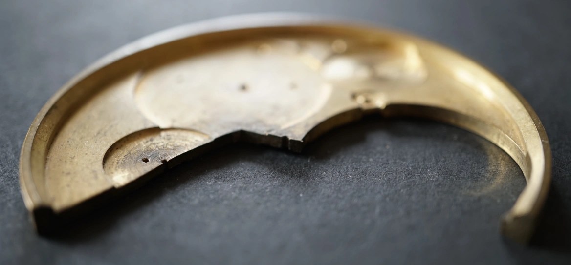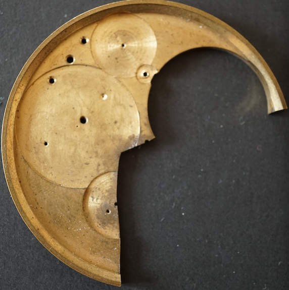 Description: Partial, destroyed brass movement ebauche for a ‘montre simple’ with equation of time (55.8mm diameter). Lever escapement and compensation balance. Wold also have featured a moon phase and a concentric annual calendar.