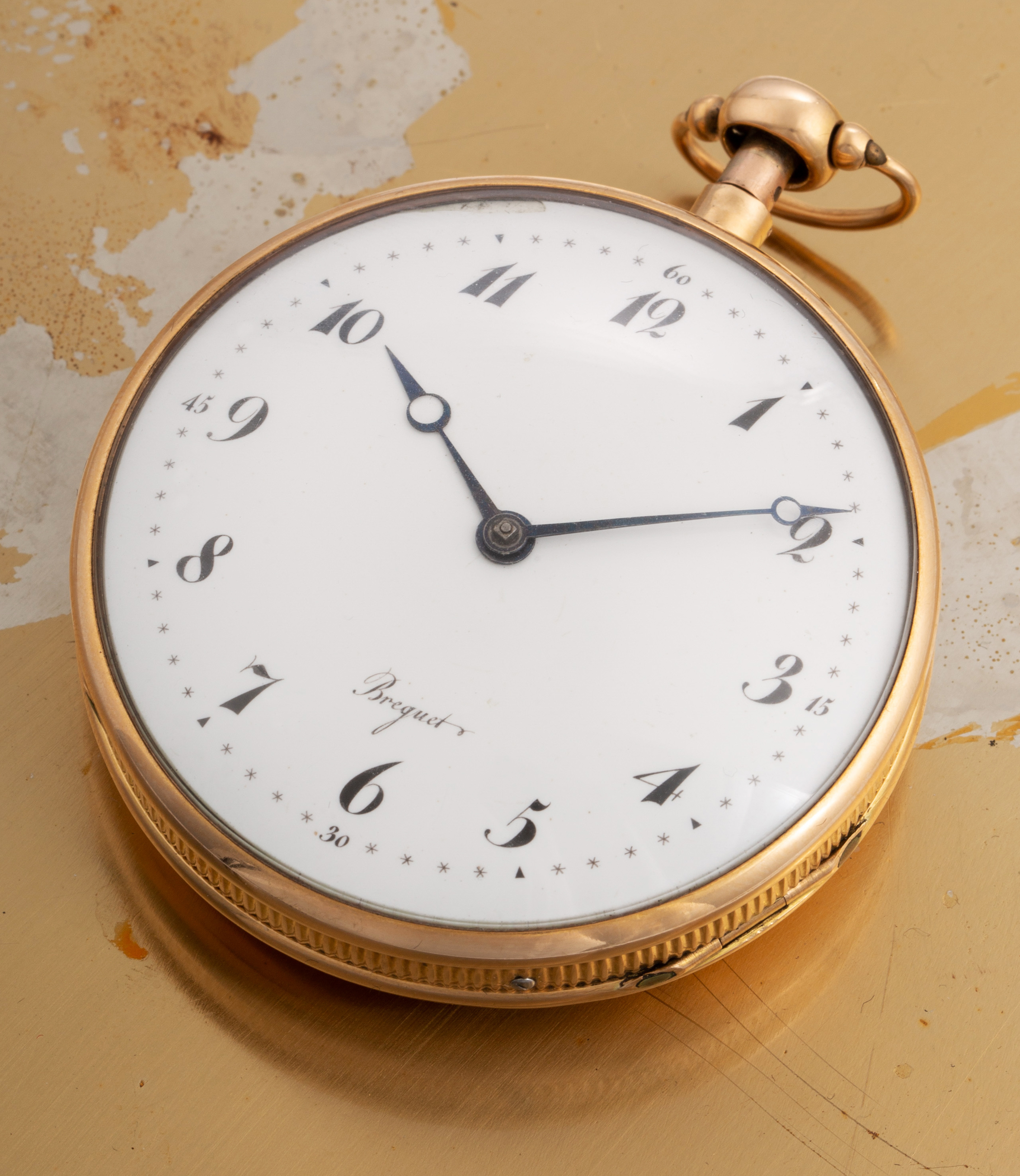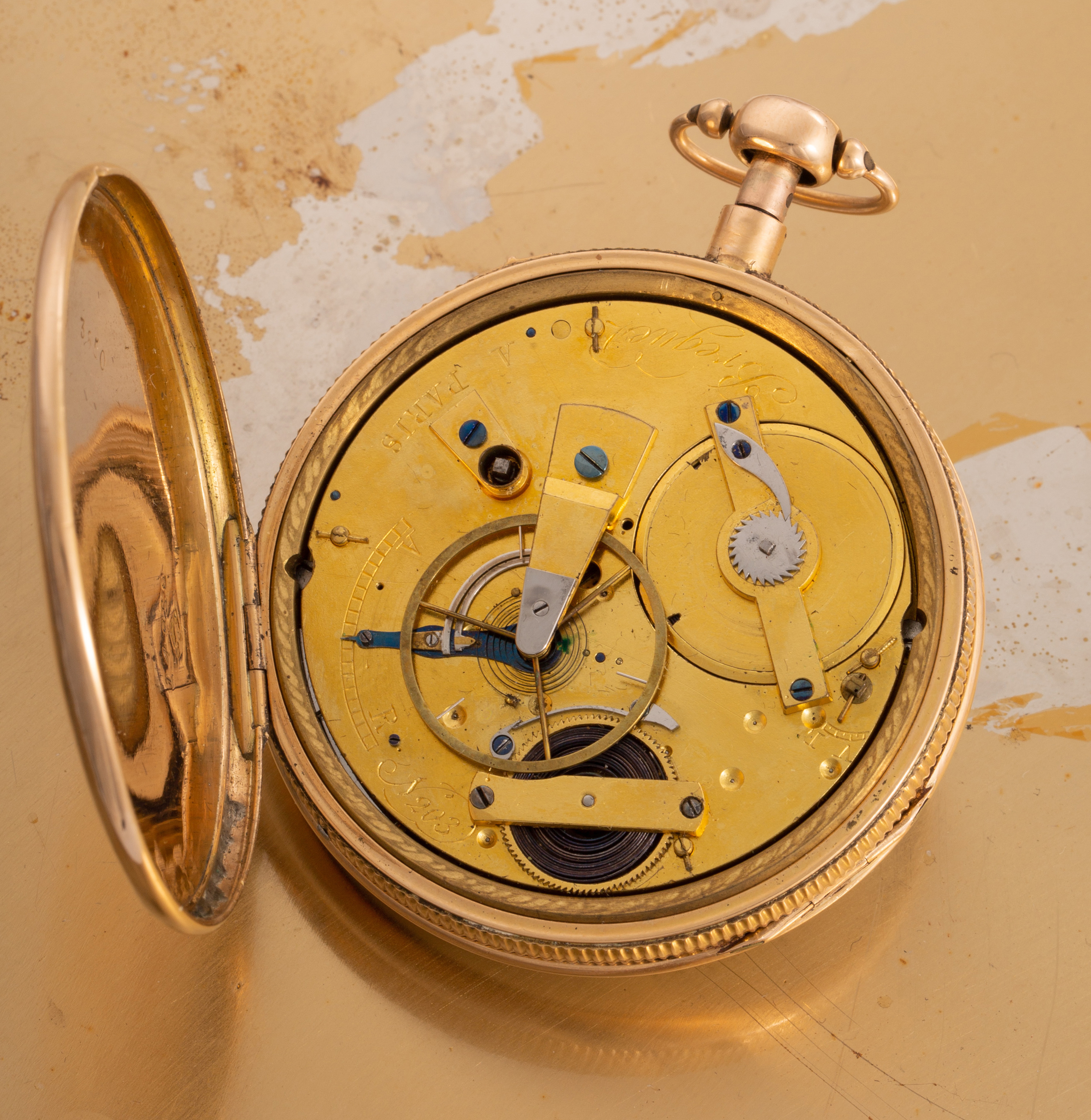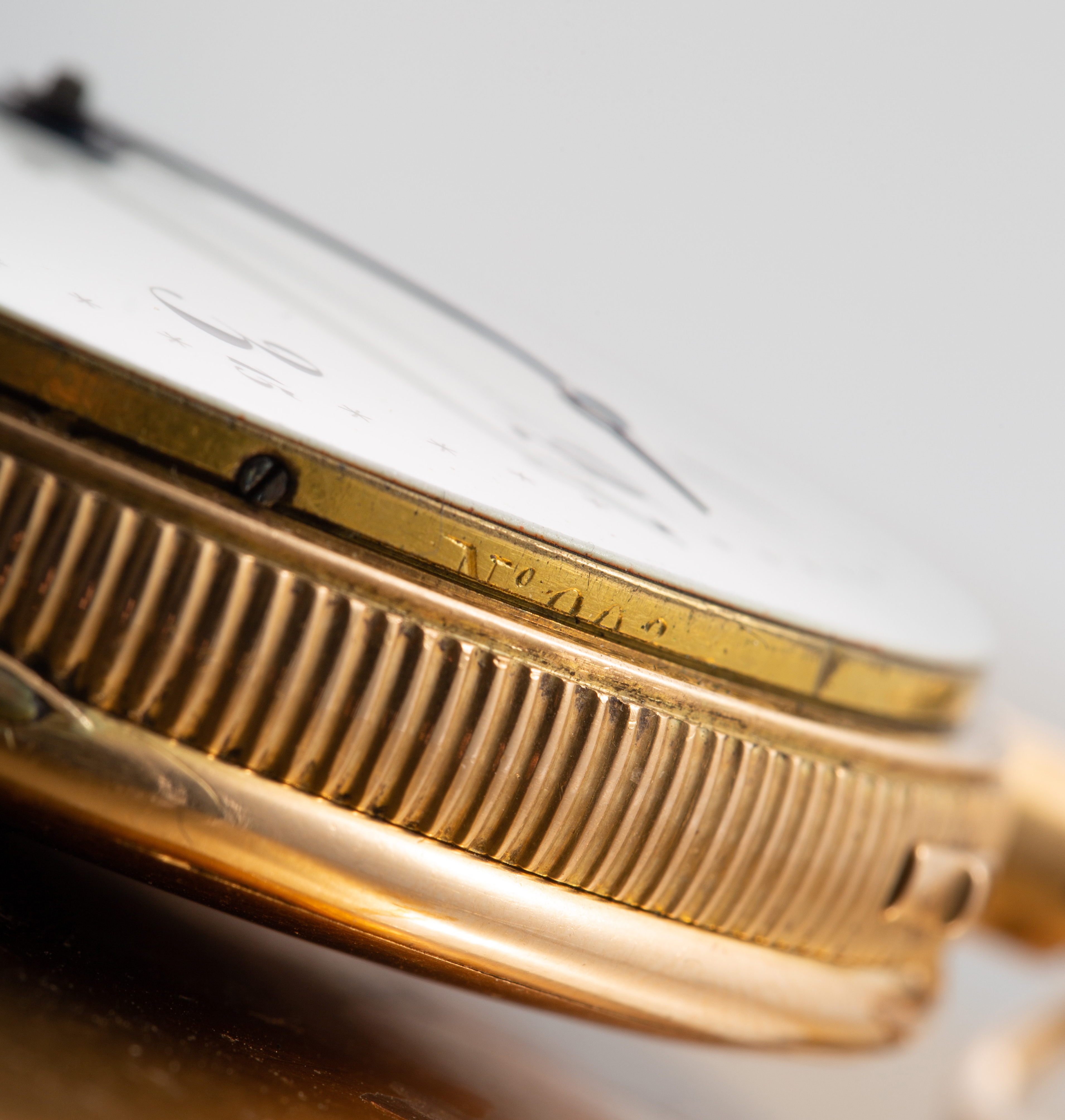 Description: Gilt brass, full plate, back wound quarter repeating á toc movement. Ruby cylinder escapement, three armed plain balance, spiral steel spring with regulator and compensation curb underneath the balance, fusee and chain. Rim of front plate engraved with ‘BREGUET A PARIS No. 203 (2nd series). Backplate with same engraving as rim. White enamelled copper dial with early cursive ‘Breguet’ signature used until 1795. Counter enamel hand signed ‘Cave Place Dauphine’. Early, flat blued steel ‘Breguet’ hands. Later gold case.