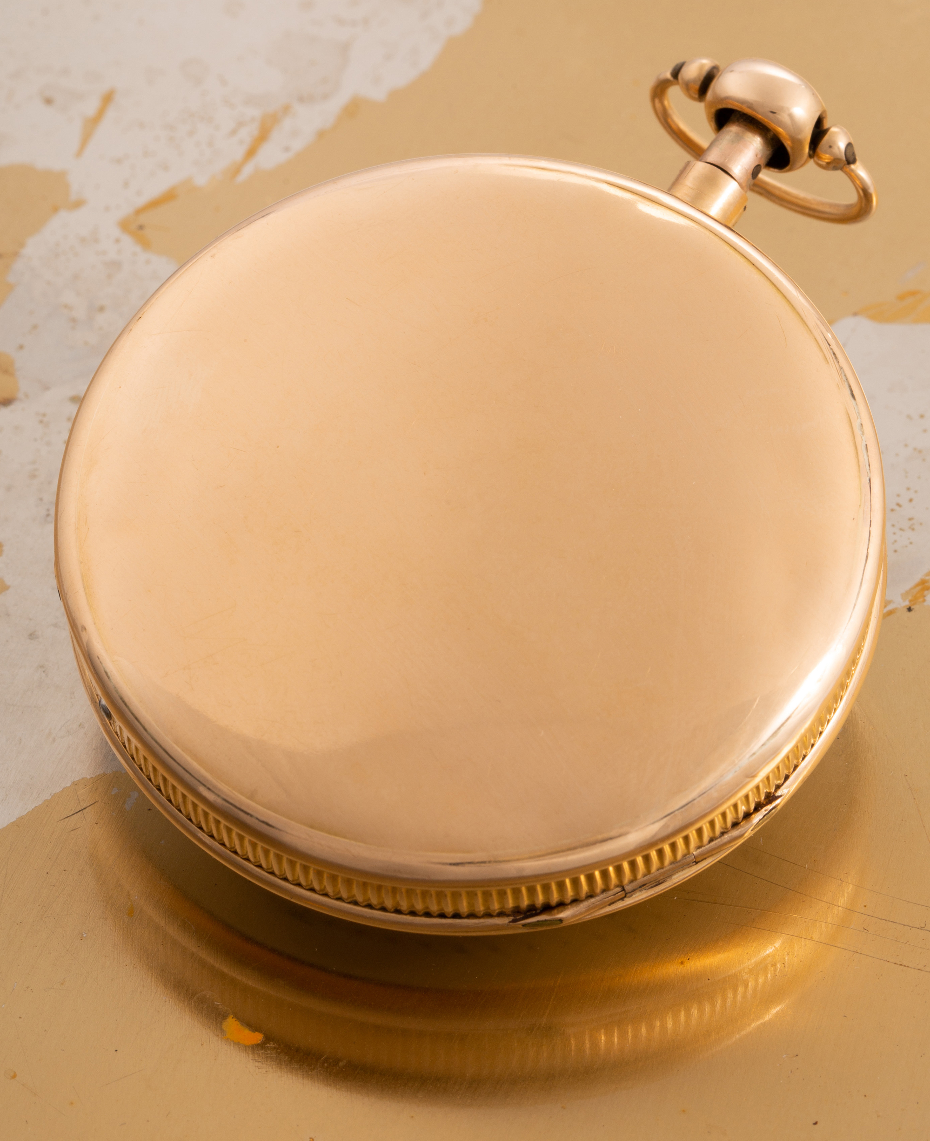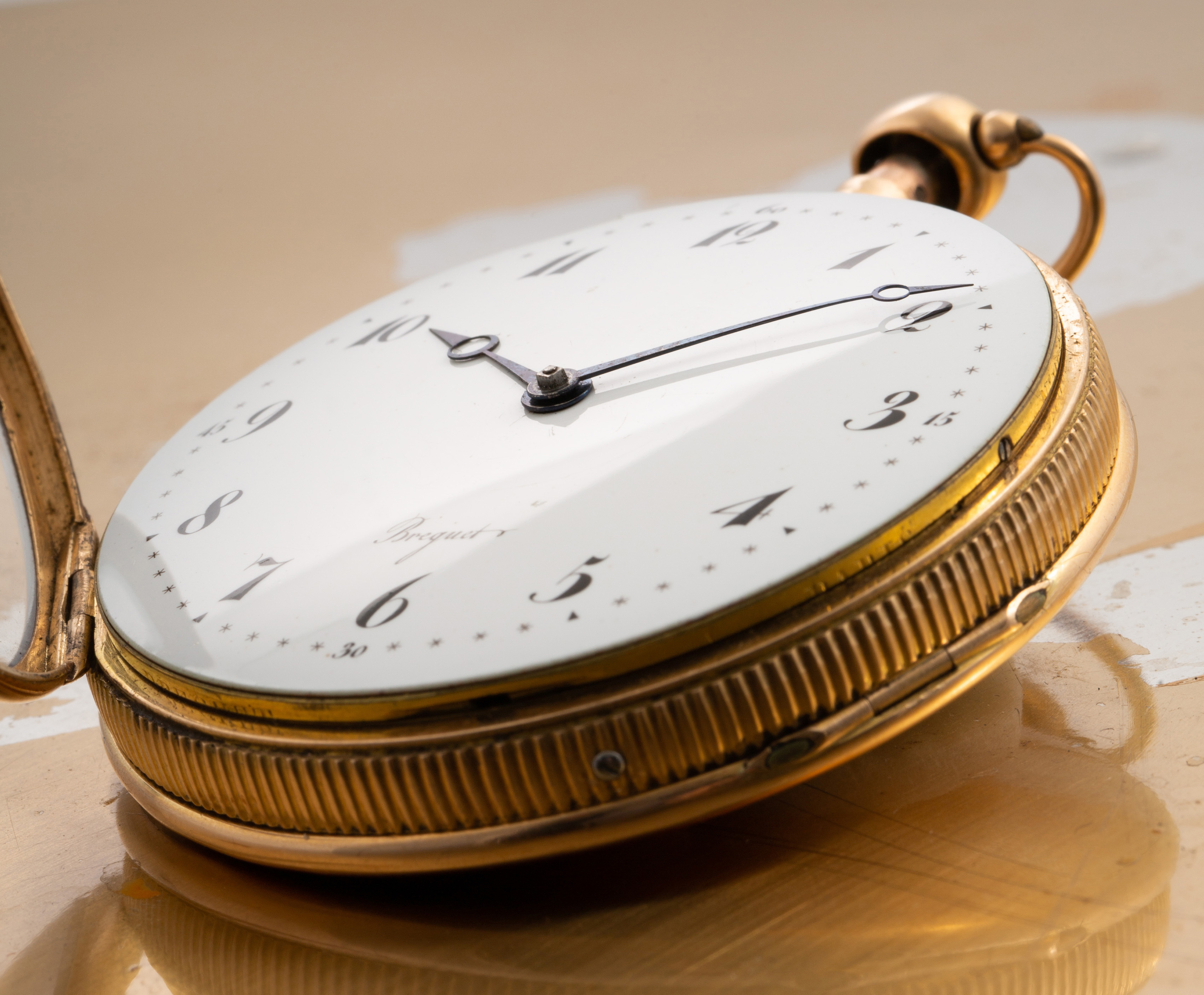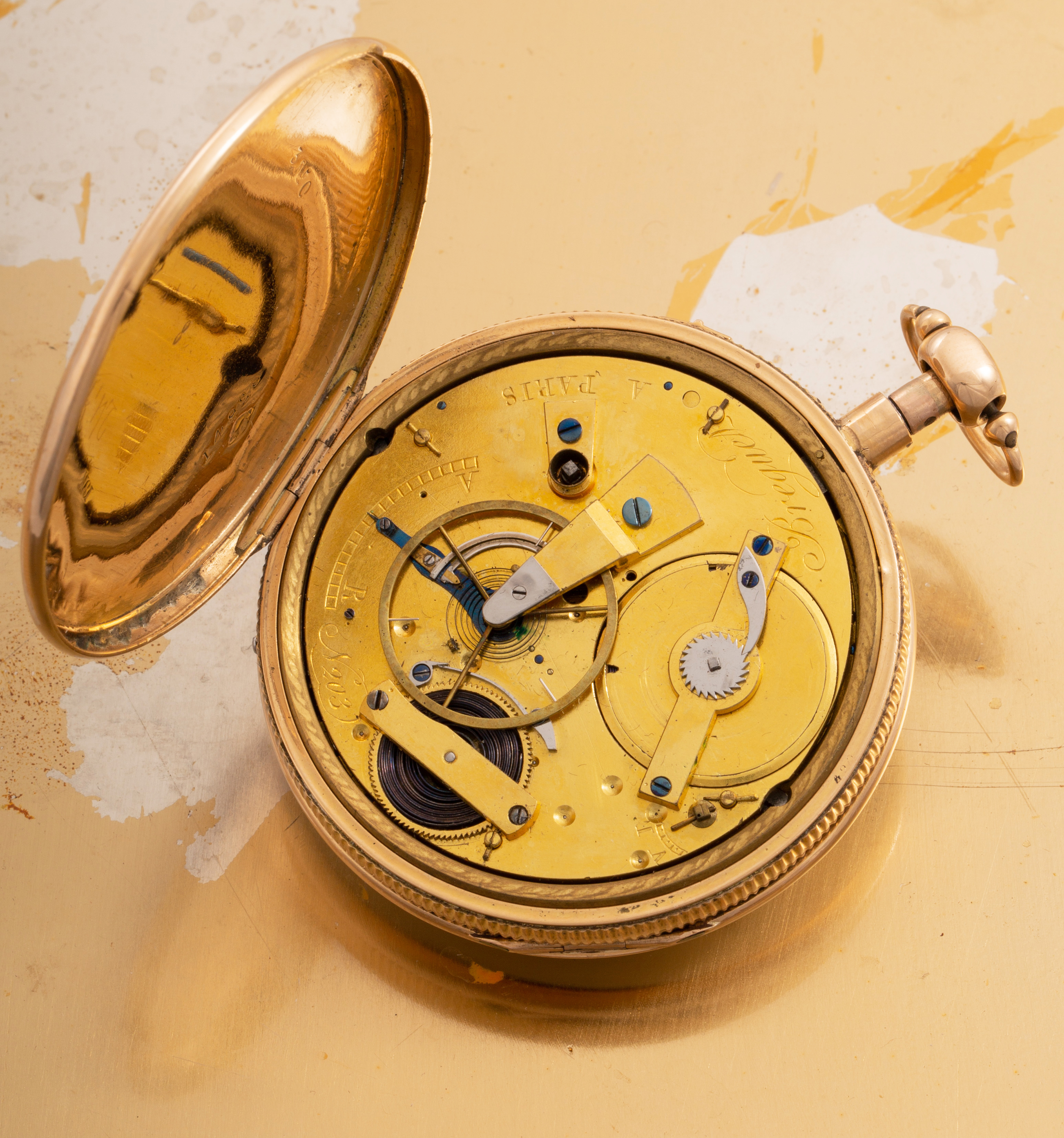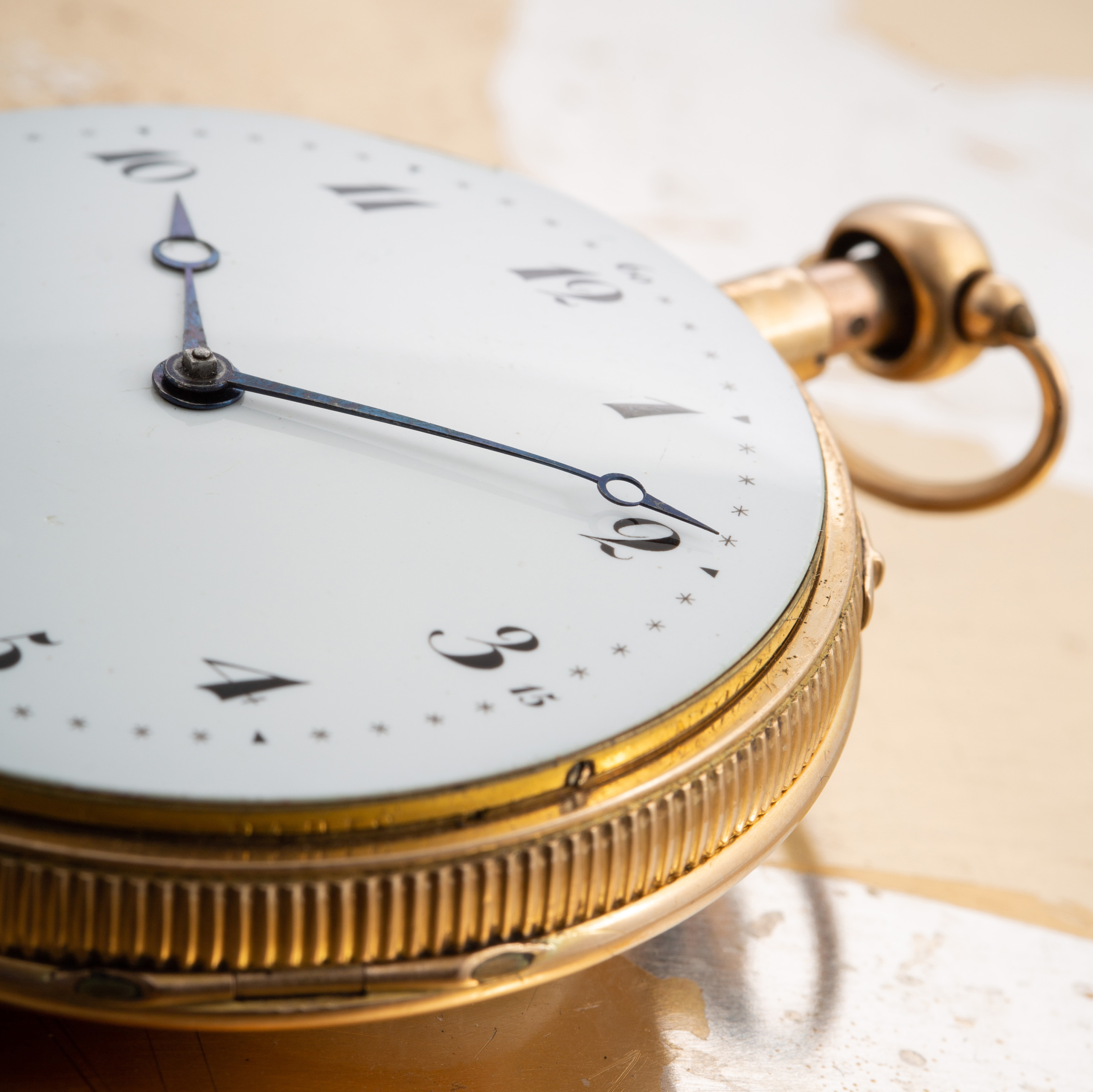 Description: Gilt brass, full plate, back wound quarter repeating á toc movement. Ruby cylinder escapement, three armed plain balance, spiral steel spring with regulator and compensation curb underneath the balance, fusee and chain. Rim of front plate engraved with ‘BREGUET A PARIS No. 203 (2nd series). Backplate with same engraving as rim. White enamelled copper dial with early cursive ‘Breguet’ signature used until 1795. Counter enamel hand signed ‘Cave Place Dauphine’. Early, flat blued steel ‘Breguet’ hands. Later gold case.