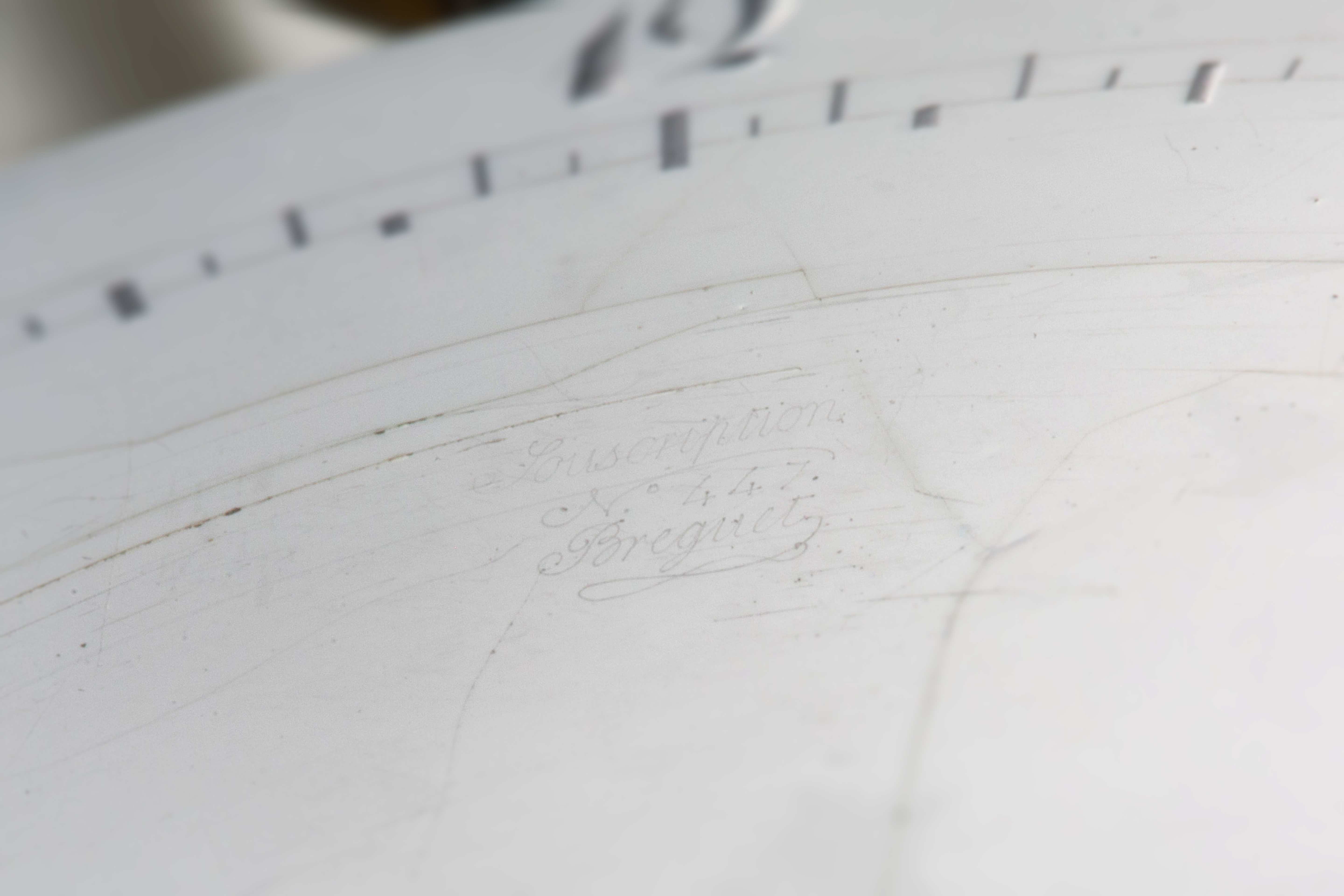 The design of the dial and the font used for the numerals resembles the ones used by Decombaz at the same time period. Thus, it is probable, that the dial was provided with the souscription ébauche. The presence of the secret signature on the dial speaks for the watch being finished in Paris, as the secret signature was only applied in the Breguet workshop.