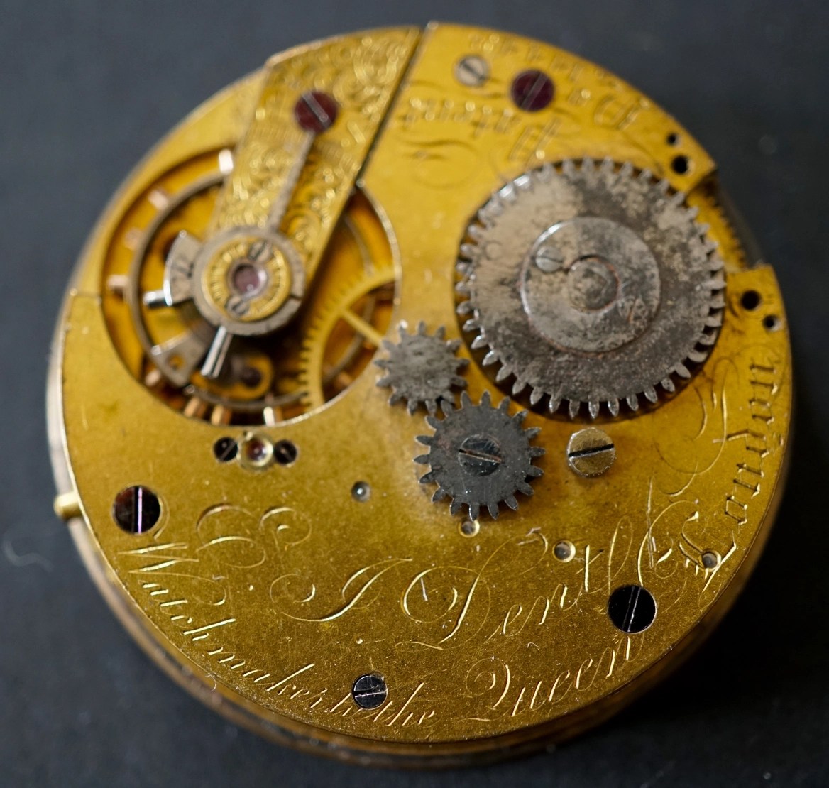 Description: Slim pillarless three-quarter plate keyless movement (33.5mm diameter), with the earliest form of keyless winding and hand-setting as originally designed and patented by Adolphe Nicole, with their serial number stamped at the foot of the cock ‘4362’. Duplex escapement retaining the ruby jewel. Compensation balance, spiral balance-spring. Signed ”E J Dent London’ copper enamelled dial with sunk seconds at 6. (A)