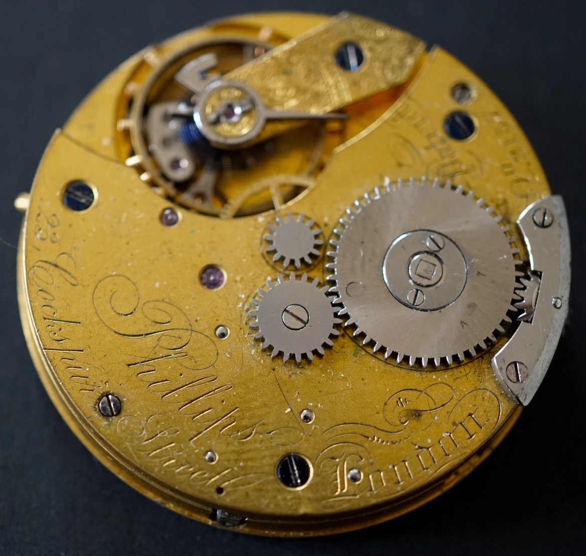 Description: Pillar-less three-quarter plate going-barrel movement (hunter set, 40mm diameter), with Nicole’s Patent keyless work retaining the steel bevel wheel bridge, Cap jewels on balance, lever and escape, the split-seconds work under the dial. Single-roller detached lever escapement, balance-spring with overcoil. Signed ‘Phillips 23 Cockspur St. London’ enamelled copper dial with seconds at 9. Dial numbered ‘No 2157’. (A)
