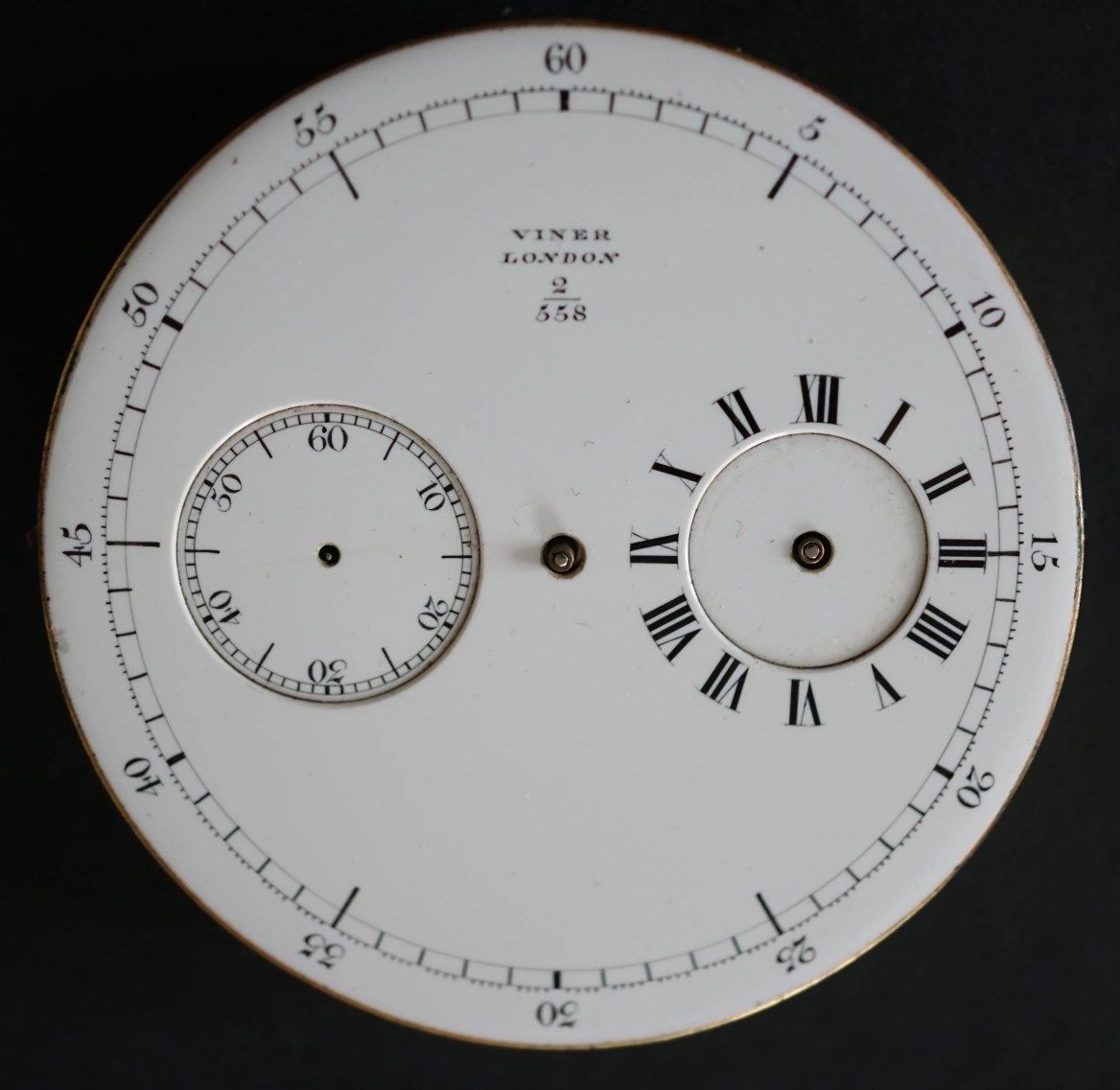 Description: Plate-less three-quarter plate keyless (hunter set) going-barrel movement (44.5mm diameter). Cap jewels on balance, lever and escape, the chronograph work mounted under the dial and the frame stamped with Nicole’s numbers 6004 and 6118. Single-roller detached lever escapement, roller with triangular jewel. Compensation balance, blued-steel balance-spring with overcoil. Signed ‘Viner London’ enameled copper dial of ‘regulator’ layout, as often used by Nicole on their chronographs at this period. Dial numbered ‘2/588’. (A)