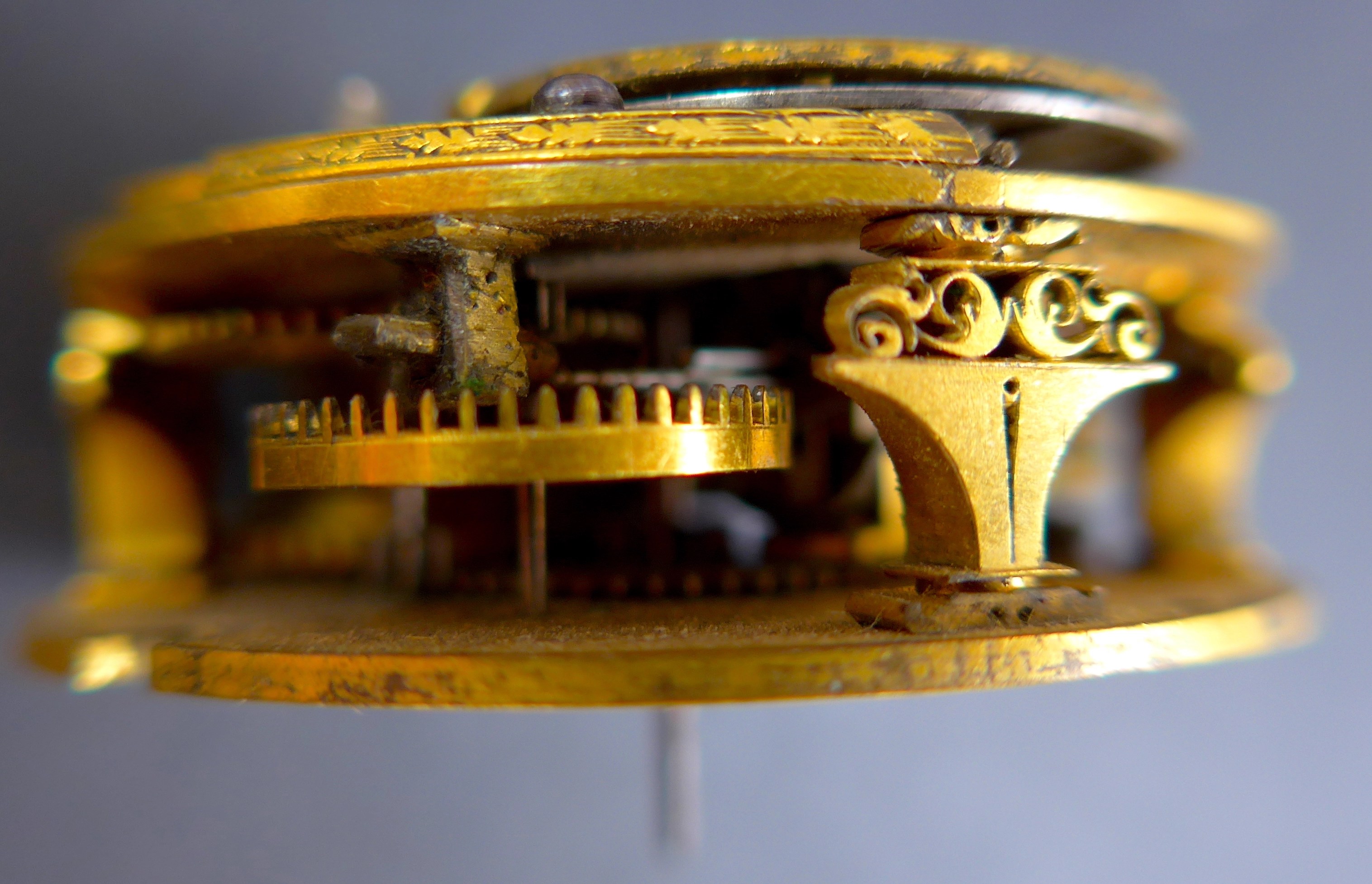 Description: Gilt brass, verge fusee movement (dial plate 41.2mm, 10.0mm between plates) with Tompion regulator, slightly angled D-shaped cock. Featuring tulip pillars, lacking, motion work, dial and hands.