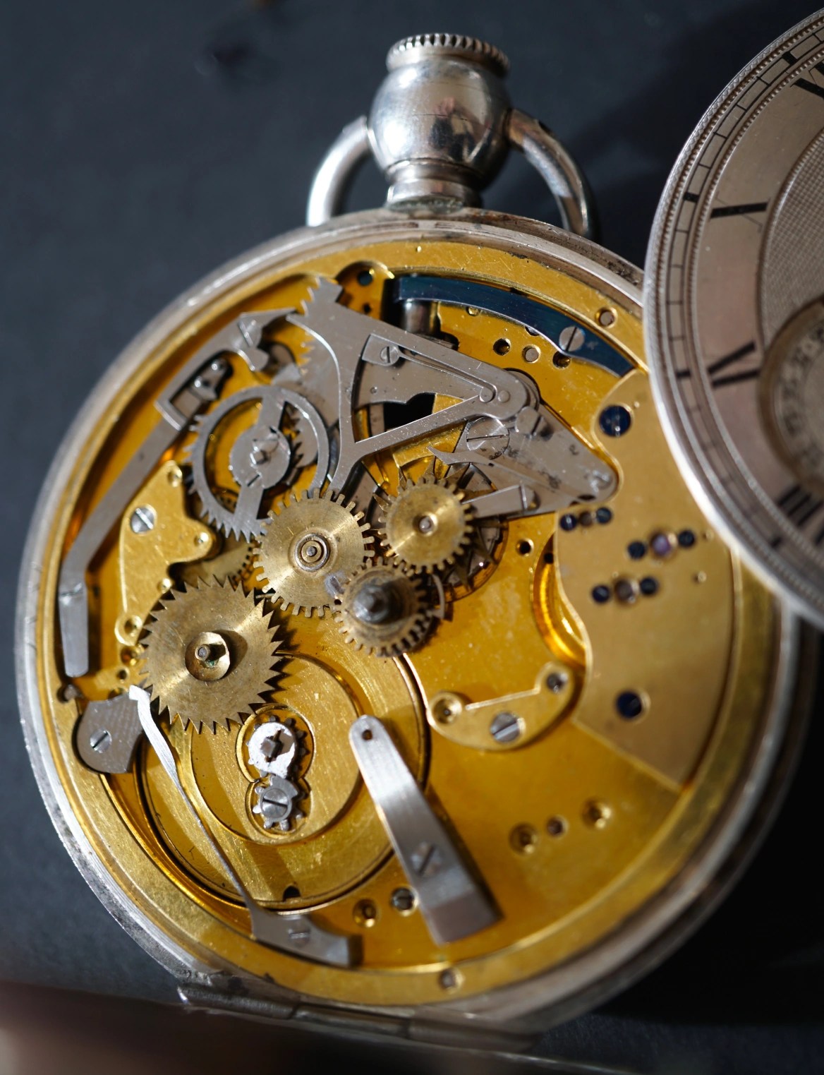 Description: Silver cased, gilt brass quarter repeating movement on gong with one steel hammer, converted (around 1910) from ruby cylinder to English lever escapement (50mm overall diameter). Later compensation balance. Jump hour system. Later (English) guillloched silver dial with two subdials (seconds and date), secured with one screw. Pull and twist activation of the repeating system. Later bimetallic compensation balance, balance spring and balance bridge. Balance bridge marked with a coventry four – arrow mid – point mark. Balance bridge well distinguishable as English by the gilding color and the index F – S instead of A – R used by Breguet and other continental workshops.