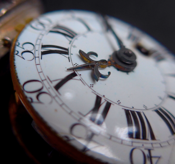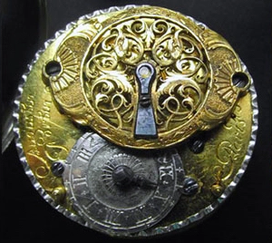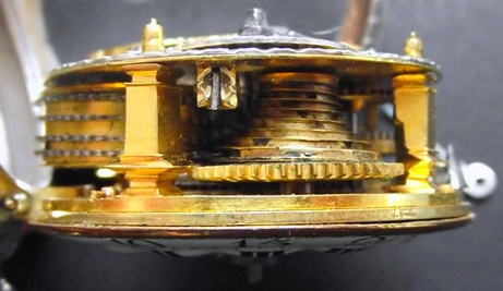 Description: Silver consular cased (50.9mm), gilt brass, front wound, verge fusee movement with silver regulator dial and blued steel regulator hand, quite small ‘big-eared’, two-footed cock with early type jeweling (sapphire) on steel cockerel. The back plate surrounded by a silver wavy inlay typical of the French regency period (1720 – 1730). Featuring square baluster pillars, enameled copper dial with bumps (rare feature, typical of the beginning of the regency period).