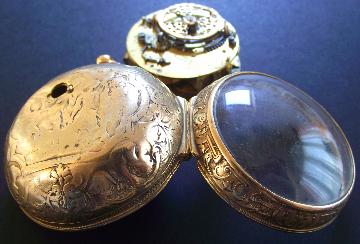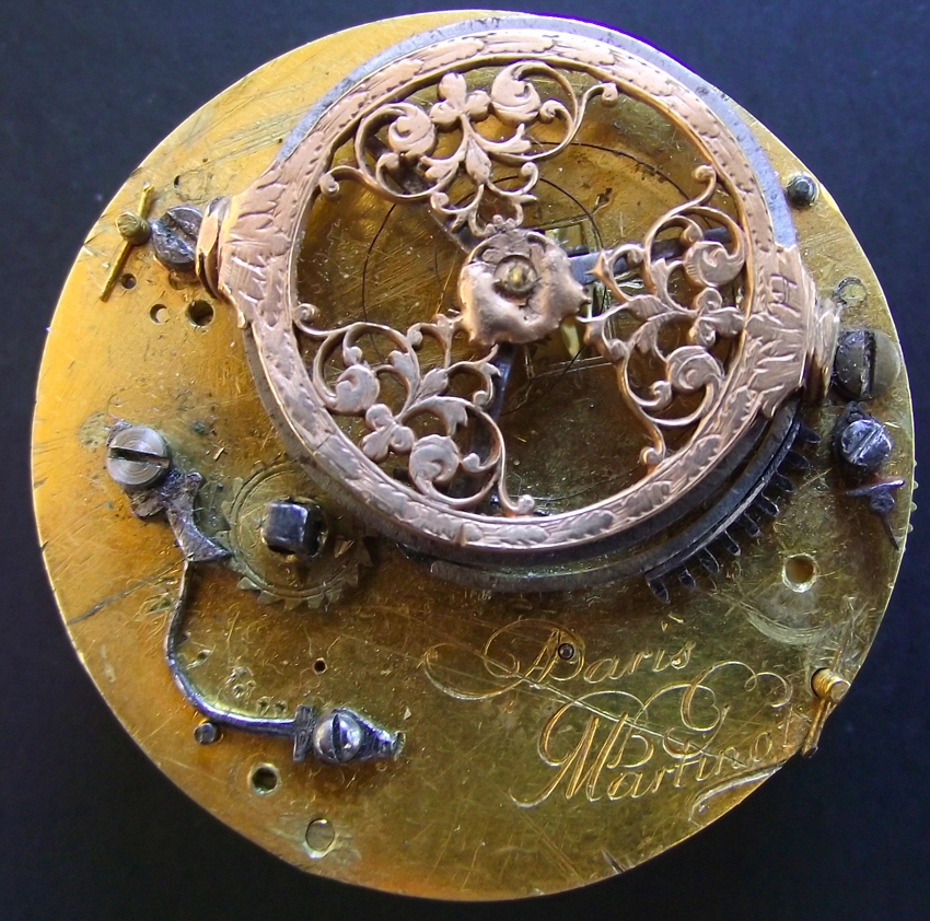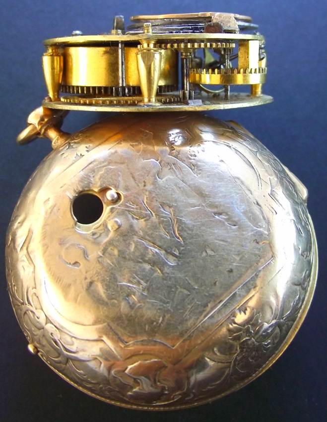 Description: Gilt brass, back wound, verge movement with NO fusee, brass three arm balance with steel balance spring. Fusee replaced by an additional fourth wheel. Gilt silver (vermeil) two footed cock. Because of the lacking chain the barrel is equipped with a wheel too, lacking hour wheel, dial plate, dial and hour hand. Cased in gilt silver (vermeil) case with typical late 17th century decoration like scallops and scrolls.
