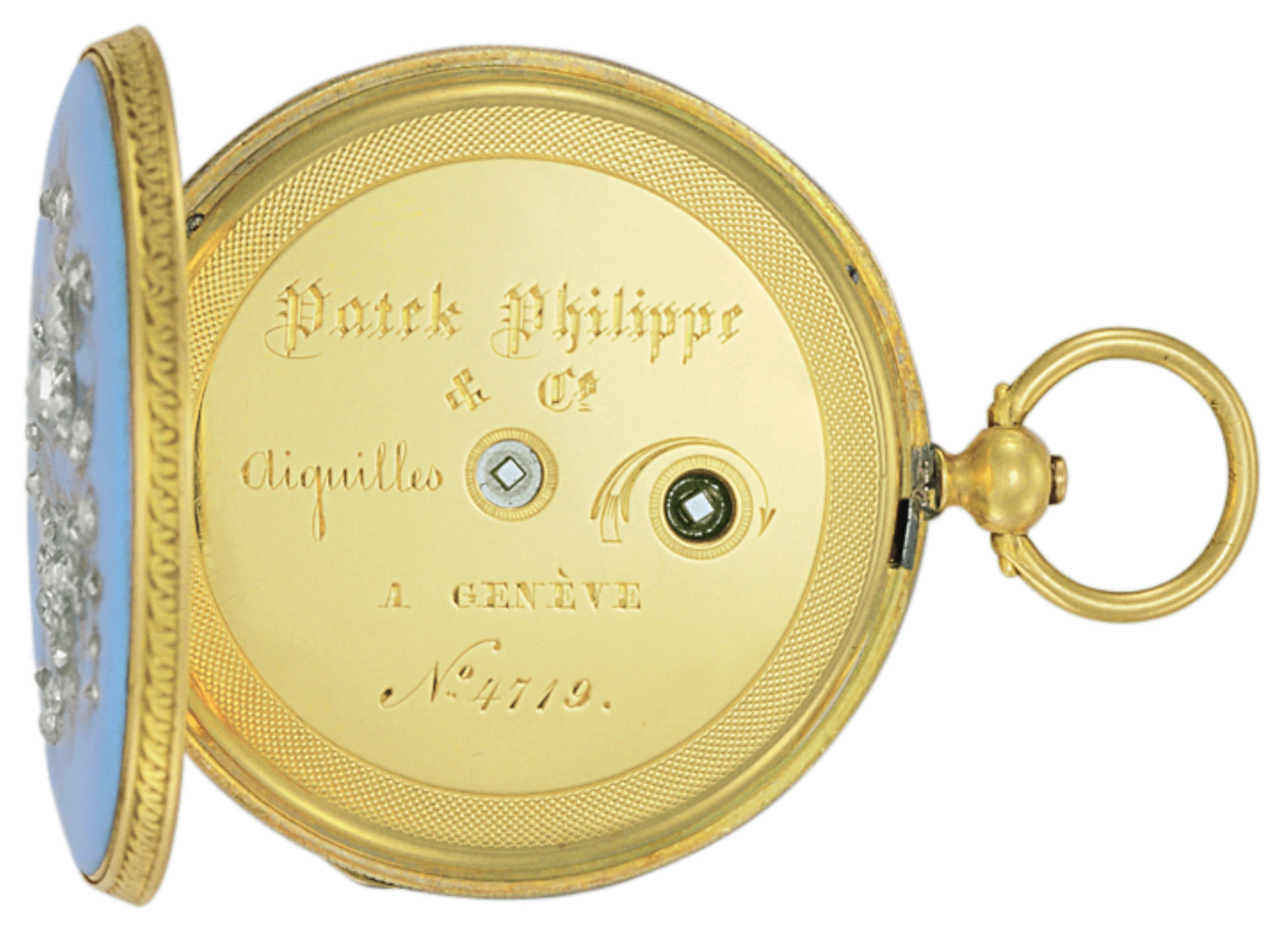 At the Great Exhibition, Queen Victoria was also presented with a second pendant watch of a similar fashion. No. 4536 displayed a bouquet of rose-cut, diamond-set roses set on a lapis blue enamel ground backdrop. In addition to the signature on the case, this particular model also has an engraving of the words, “INVENTION BRÉVETÉE.” This marking indicates that the watch employs Jean Adrien Philippe’s stem-winding system. Soon after, Queen Victoria appointed Patek Philippe as her royal watchmaker. Her appreciation for these timepieces helped put the brand on the map, especially in countries who did not previously have an association with the manufacturer (1).