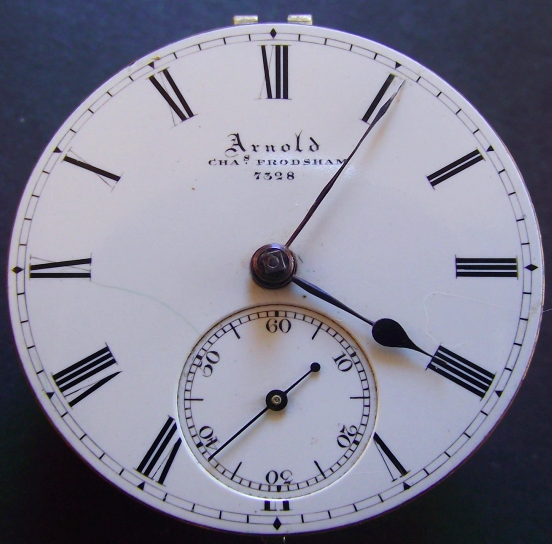 Description: Gilt brass, back wound movement of typical English manufacture. Featuring bi-metallic compensation balance. Maintenance on the fusee, like in many good English movements. Single foot balance cock lacking its jewelling. Single roller detached lever escapement featuring a brass club-tooth escape wheel. Enamelled copper dial with signatures ‘Arnold Chas Frodsham No. 7328’, subsidiary seconds dial at 6 o’clock. The subsidiary second dial is a separately inserted enameled copper disc, which is a sign of English high quality movements. Blued steel hands.