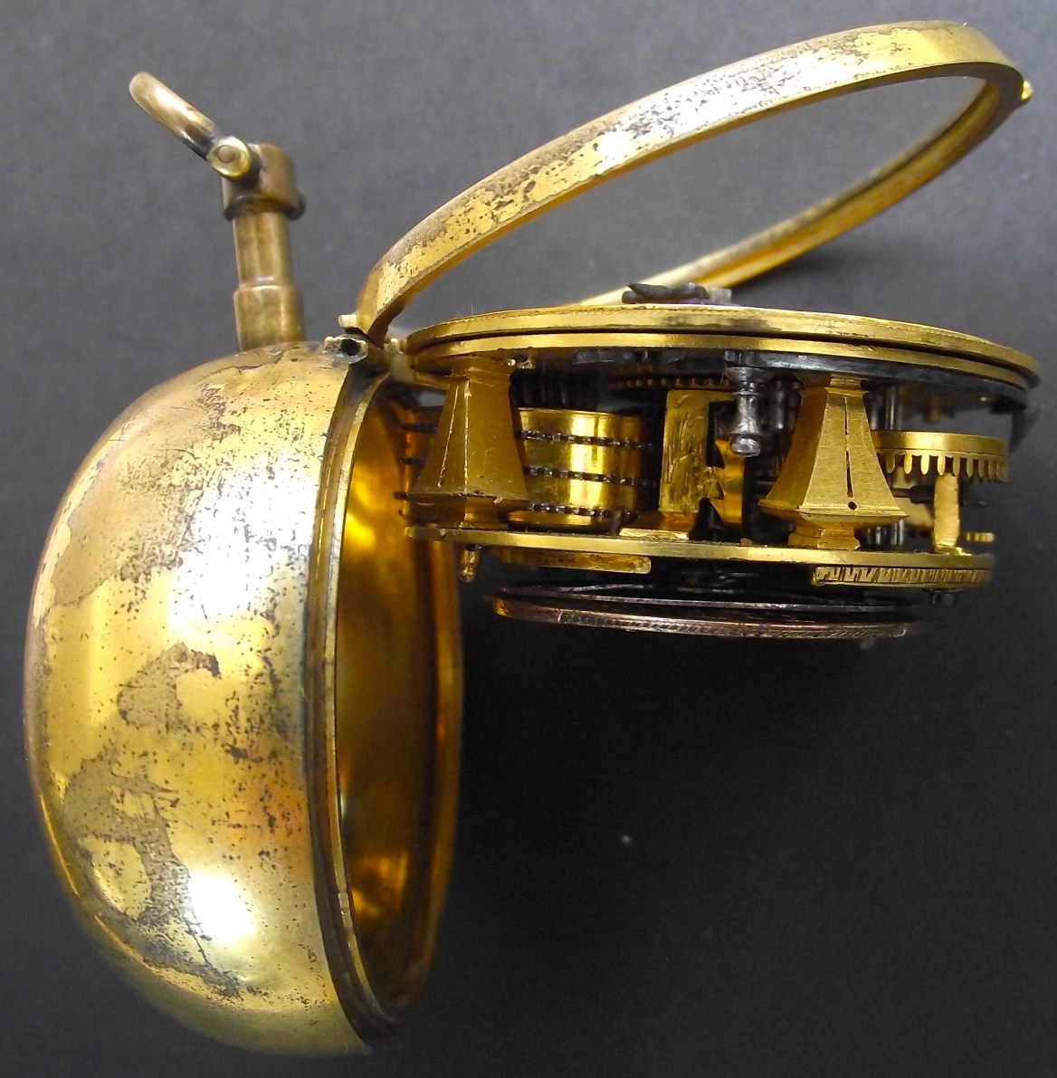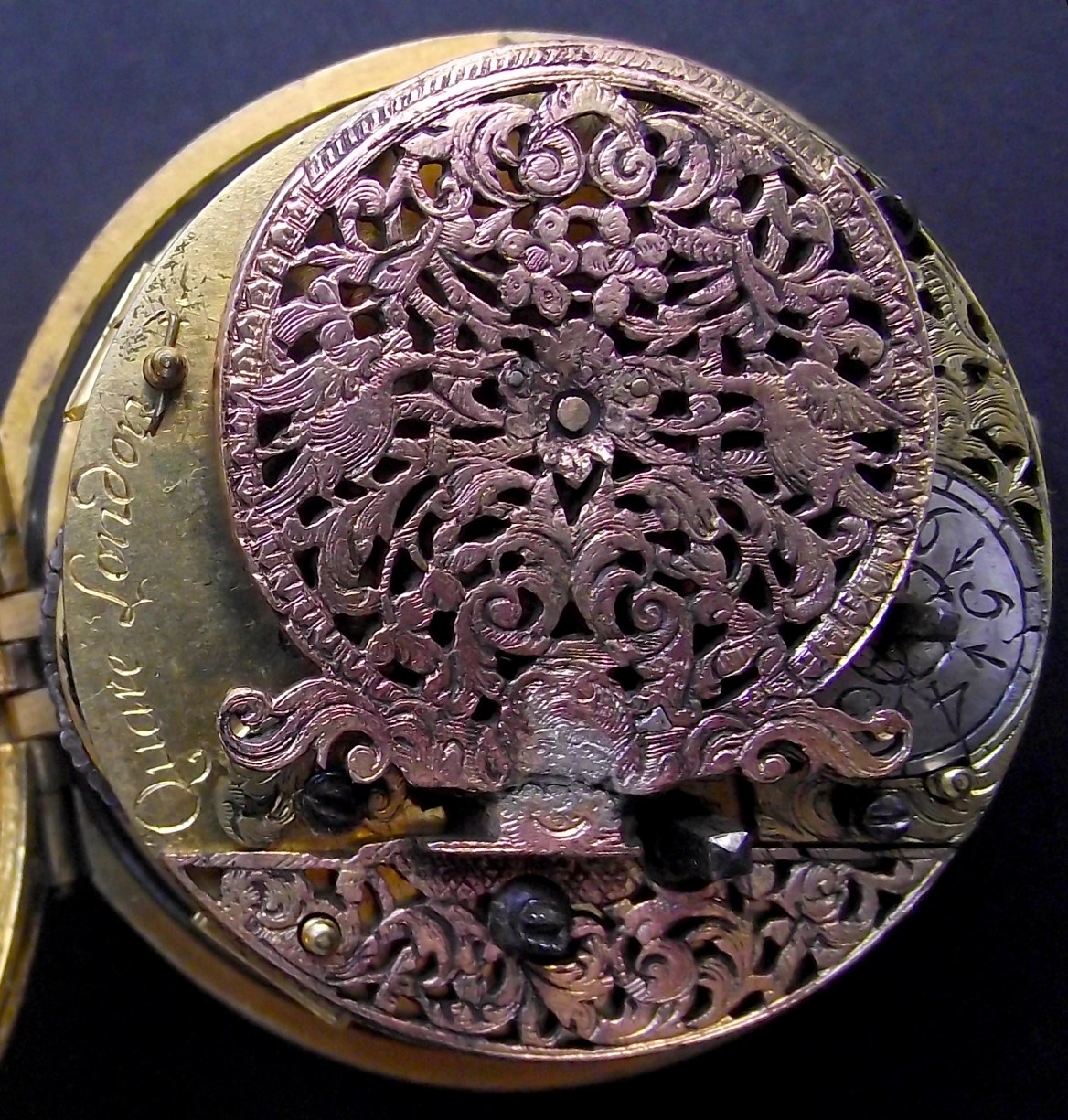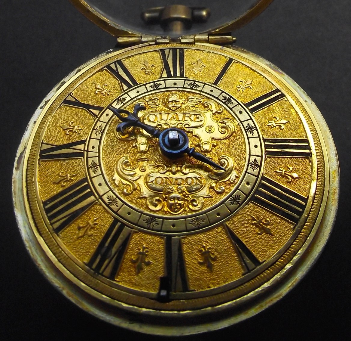 Description: Gilt brass cased watch (inner case 51.3mm, later pendant and bow), with gilt brass, verge fusee movement with Tompion regulator, D-shaped cock-foot with cock of big diameter. Featuring Egyptian pillars, gold champlève dial signed ‘QUARE LONDON’ with one blued steel hand.