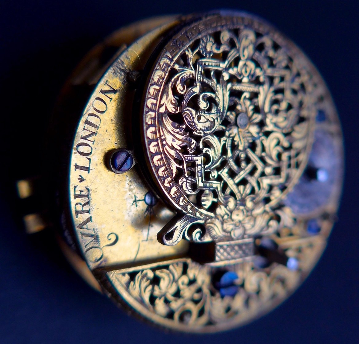 Description: Gilt brass, verge fusee movement (top plate 43.7mm, 10.6mm between plates) with Tompion regulator, D-shaped cock-foot with small diameter cock. Featuring Egyptian pillars, lacking dial plate, motion work, dial and hands. The manufacture of the movement shows, that it was constructed with hour and minute hand (to the contrary of the other watch by Quare of 1680).