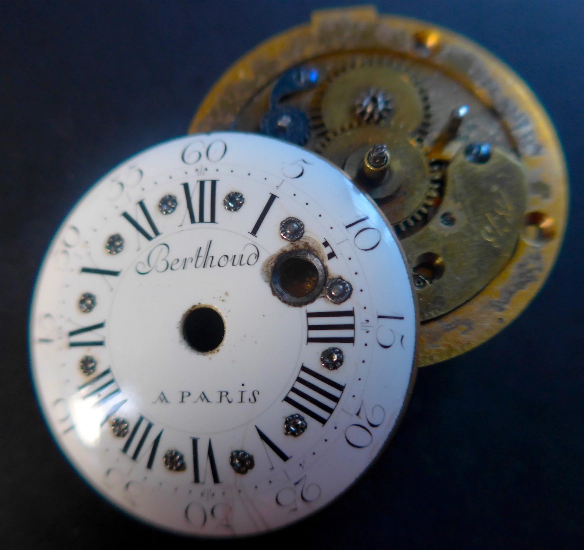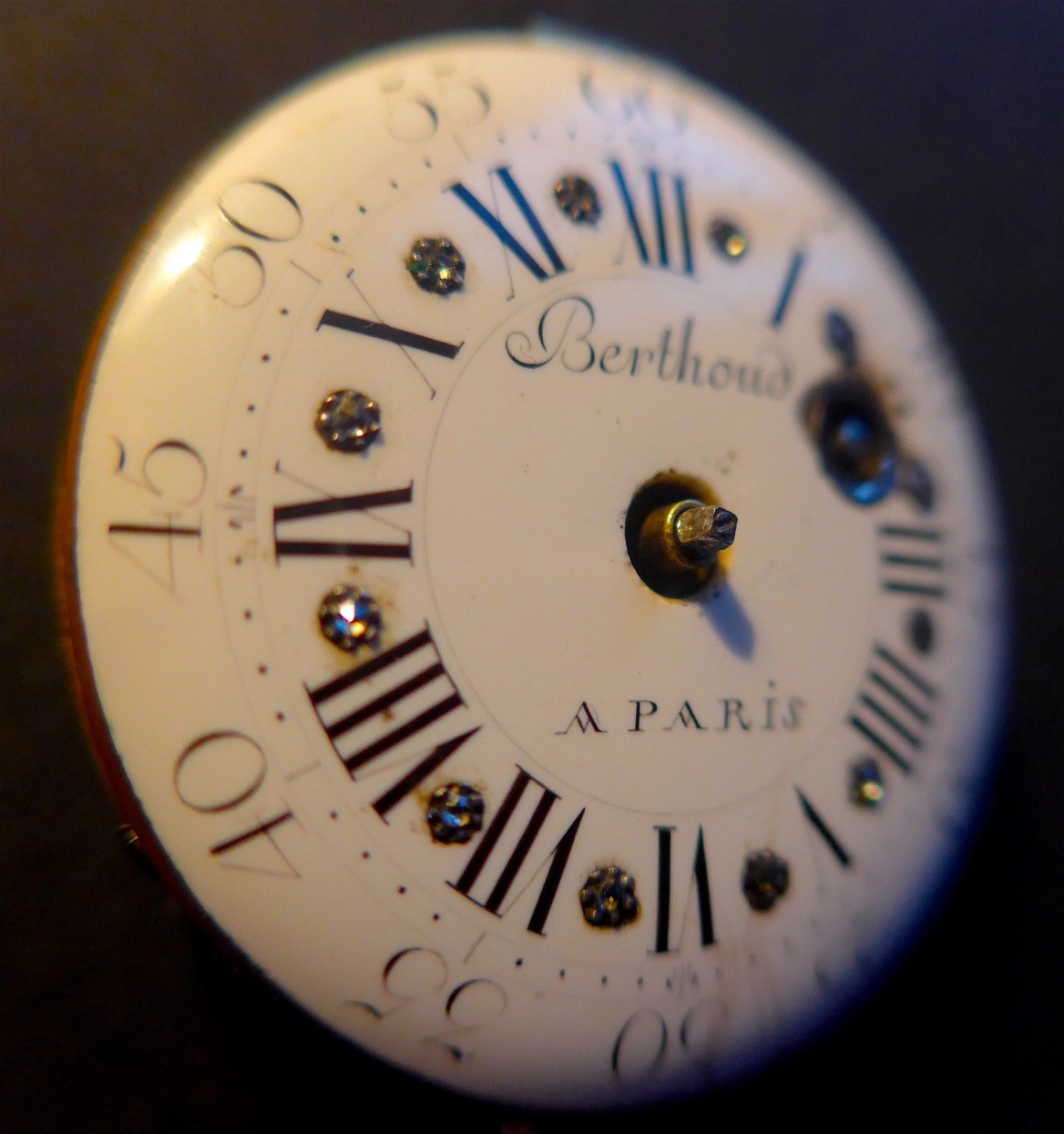 Description: Gilt brass, front wound, verge fusee movement (35.4mm diameter). Silver regulator dial and steel regulator hand, medium sized two-footed cock with steel cockerel. Featuring round pillars. Backplate signed ‘Berthoud A Paris’. Enamelled copper dial with silver buttons inlaid with small diamonds (except for two) between the hours, signed ‘Berthoud A PARIS’. Counter enamel numbered ‘2078’.