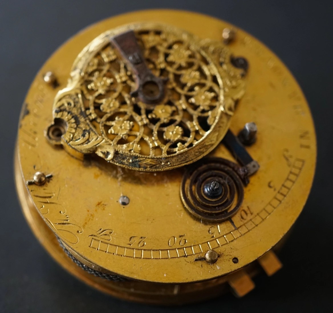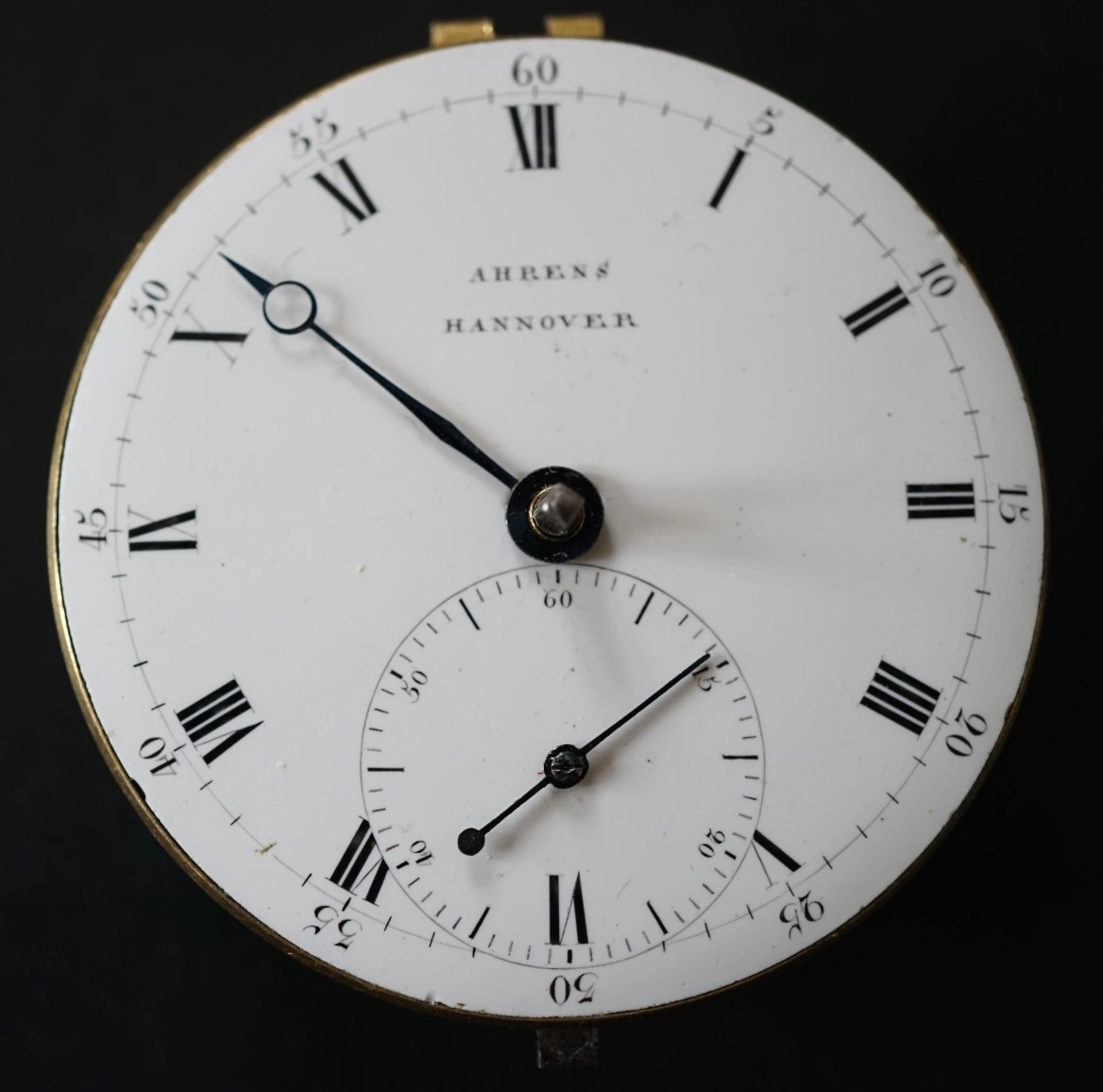Description: Gilt brass, full plate movement (diameter: 43mm) with going-fusee of individual design, maintaining pawl spring mounted the dial side of the pillar-plate, with French/Swiss style balance-bridge with jewelled coquerette (French style as well), and spiral (Chelsea bun) compensation-curb mounted on the index. Cylinder (deadbeat) escapement with 15-tooth brass escape. Brass balance. spiral balance-spring. One-piece signed ‘Ahrens Hannover’ enamelled copper dial with subsidiary seconds at 6, blued-steel hands. Scratch numbered 2 on the brass edge and in the counter-enamel of the dial (A)
