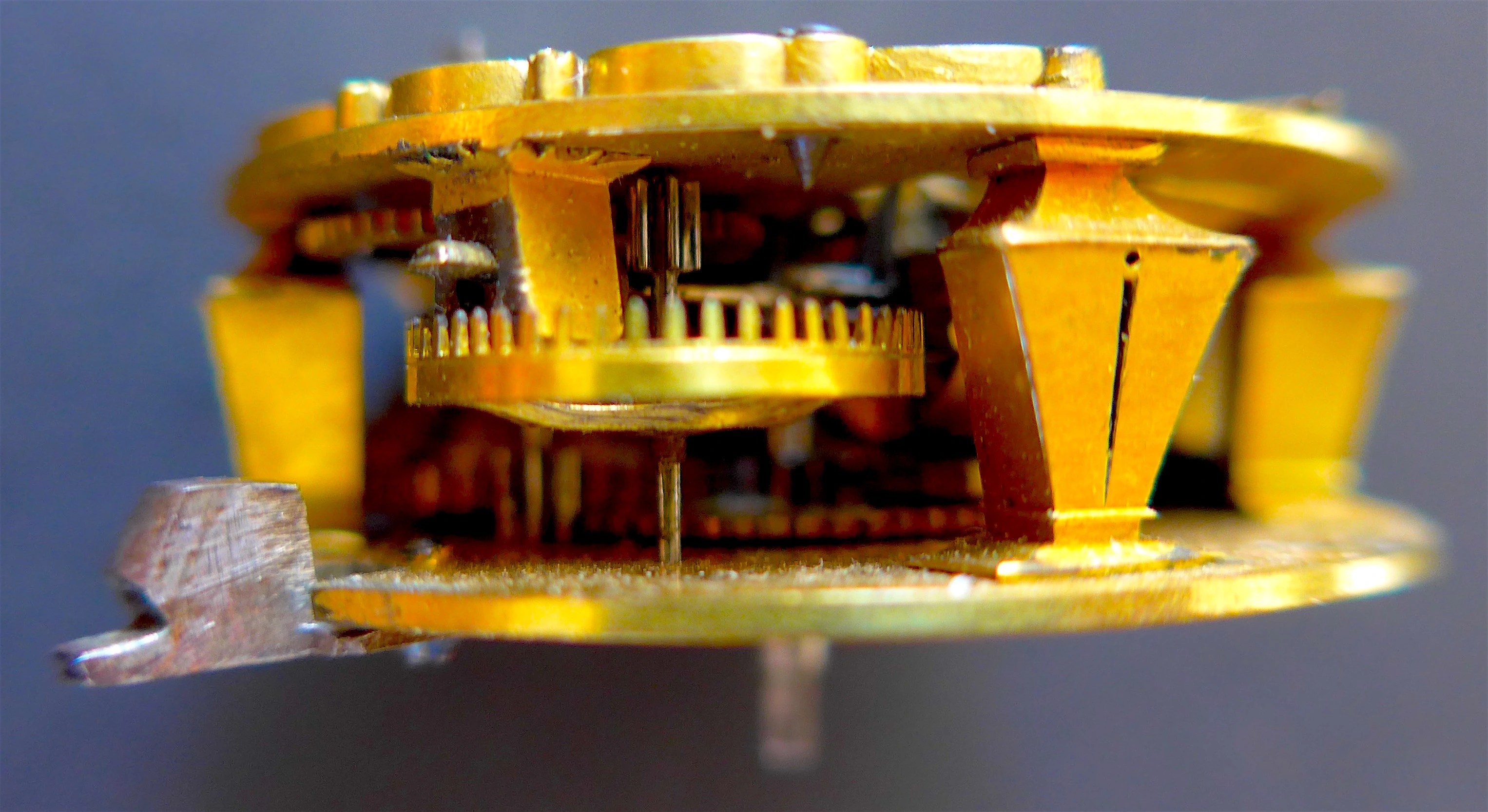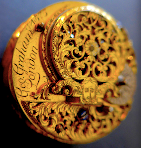 Description: Gilt brass, full plate fusee movement (40mm diameter) of typical Graham caliper, with pierced and engraved cock and slide plate, the cock with Grahams portrait face instead of the usual grotesque mask. Verge (recoil) escapement. Steel balance, the blued steel balance spring held by square pin, as first used by Tompion. Production number embossed on the top plate and behind the cock, as also custom in Tompion’s workshop. (A)