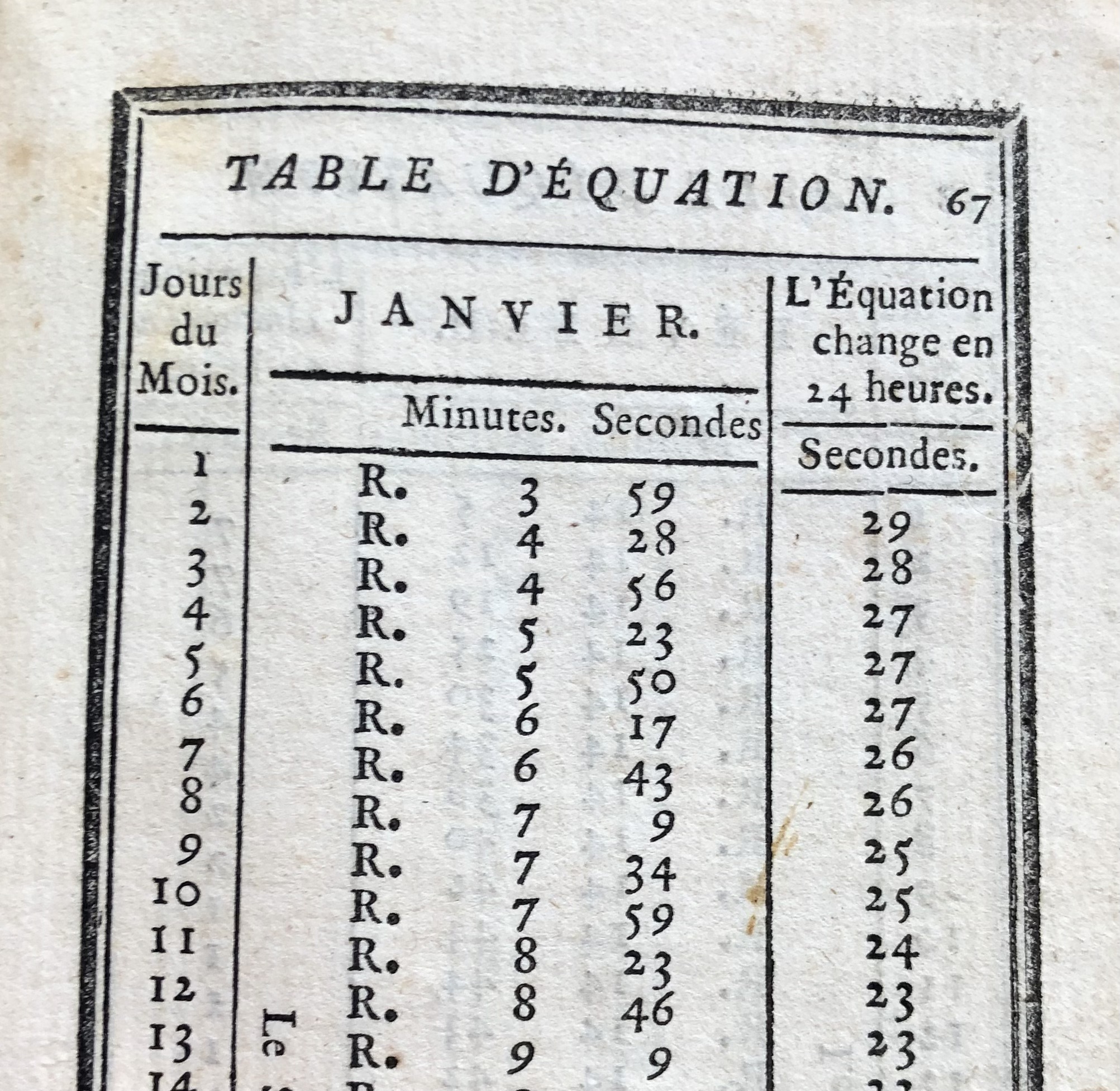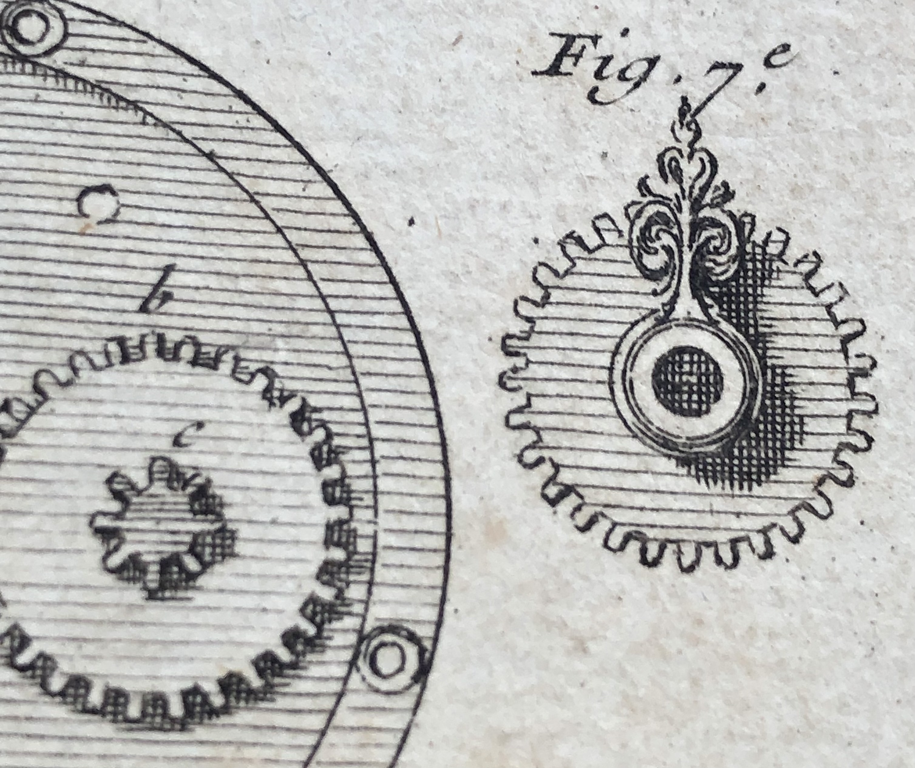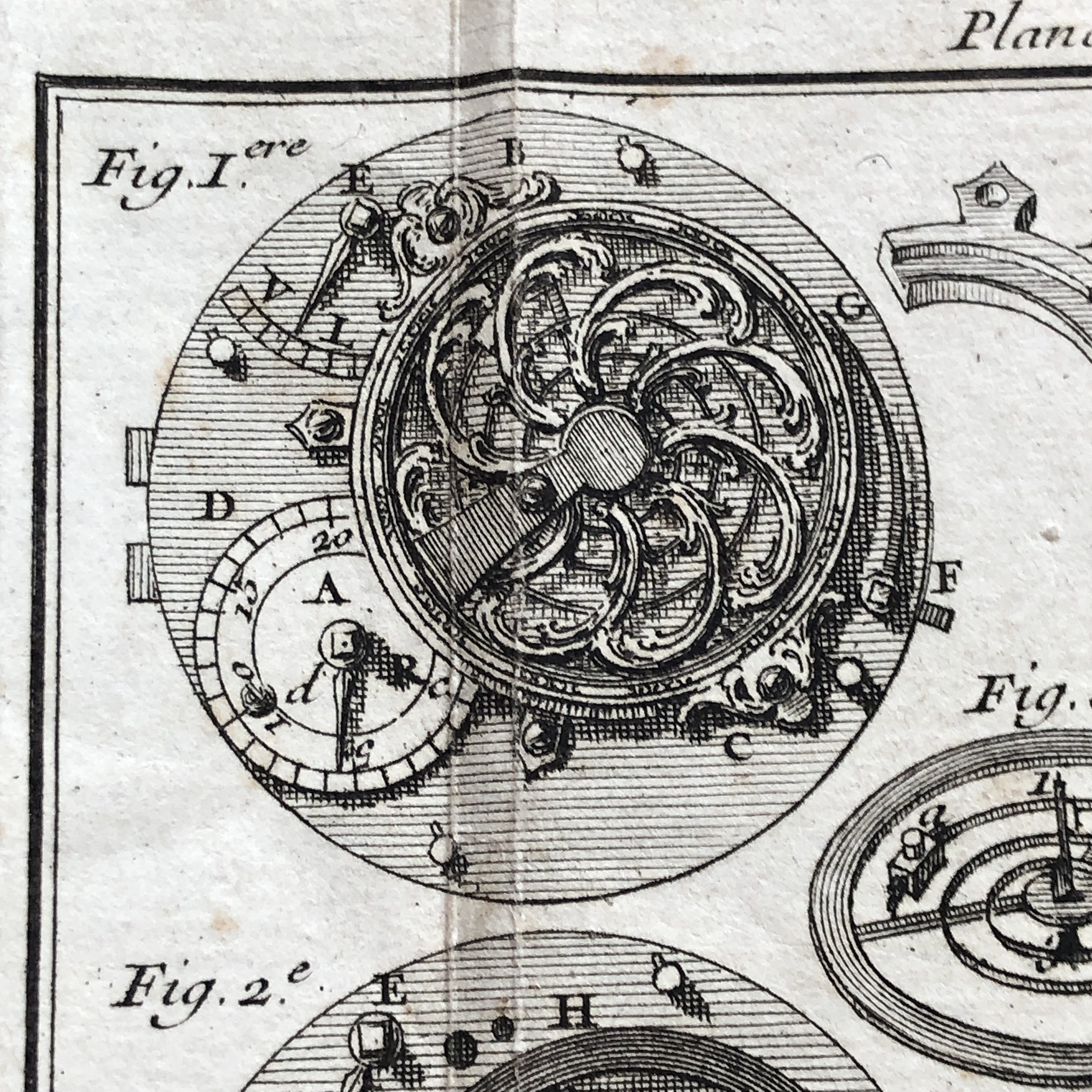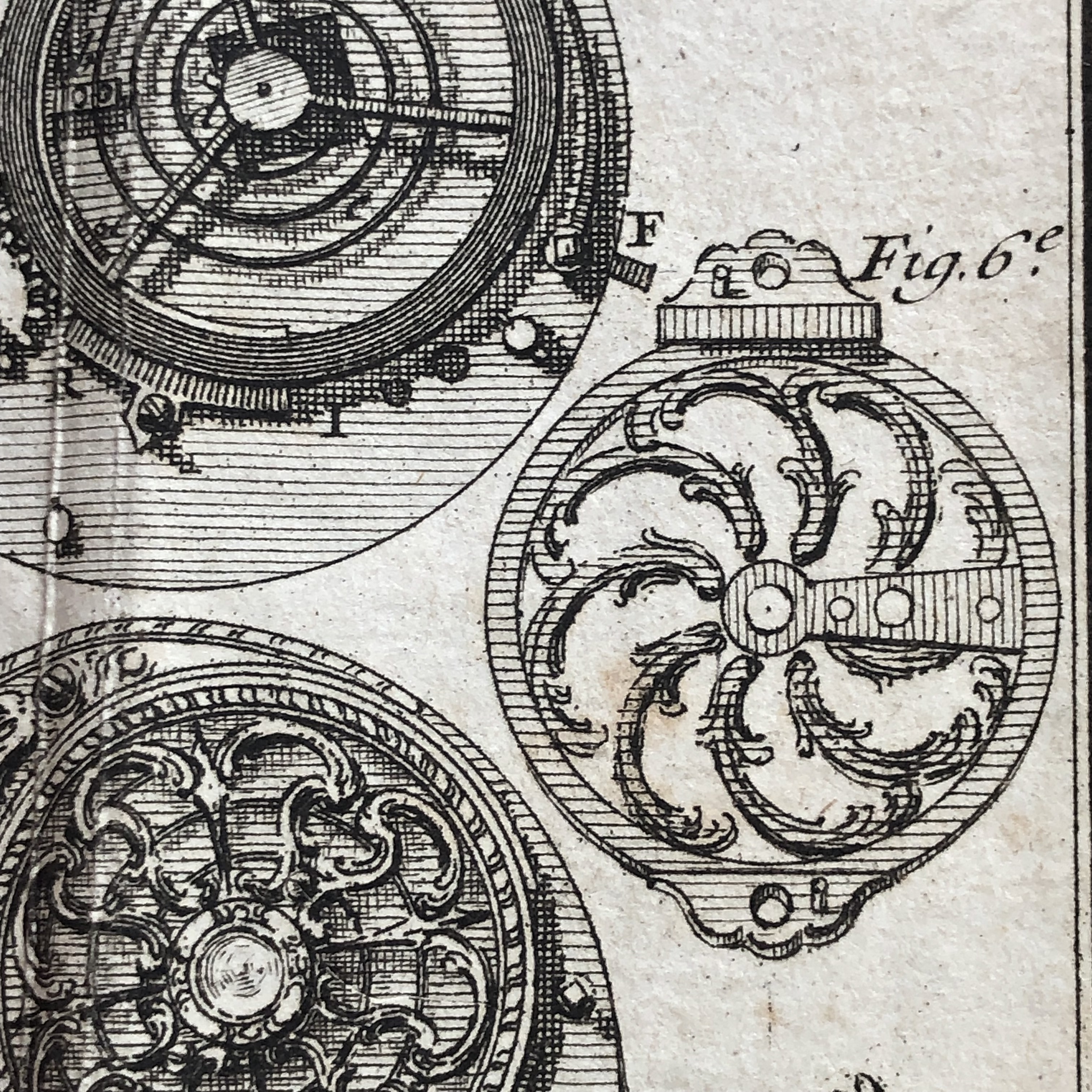At the end of the book one can find tables for the equation of time and four engravings to fold out, showing several mechanical drawings of watch -and clock movements and some of their parts.
