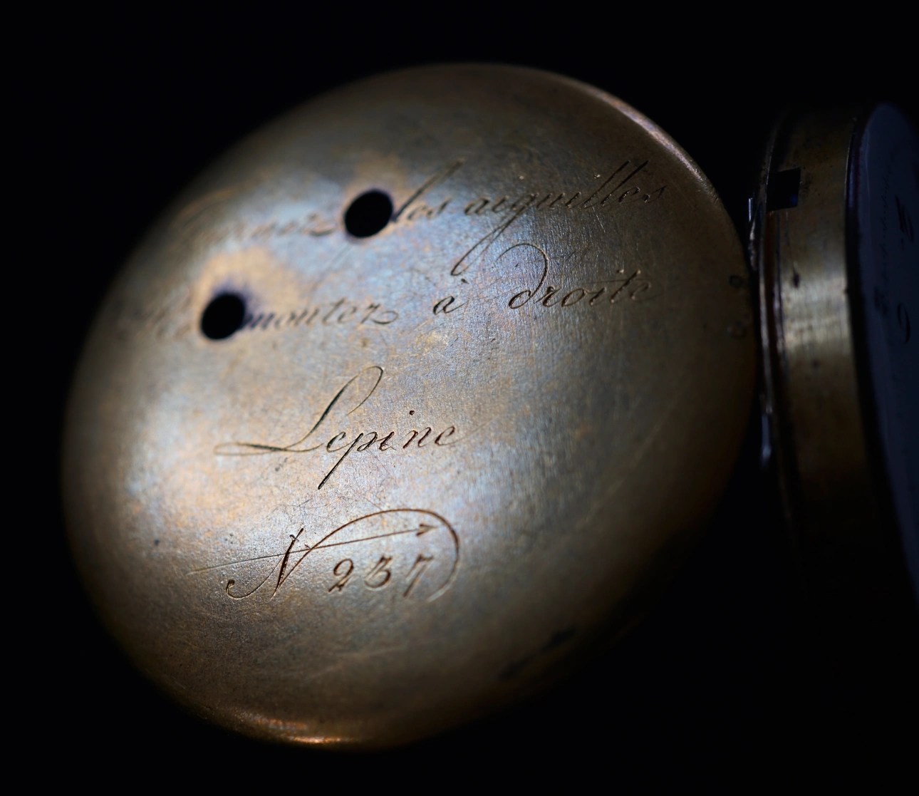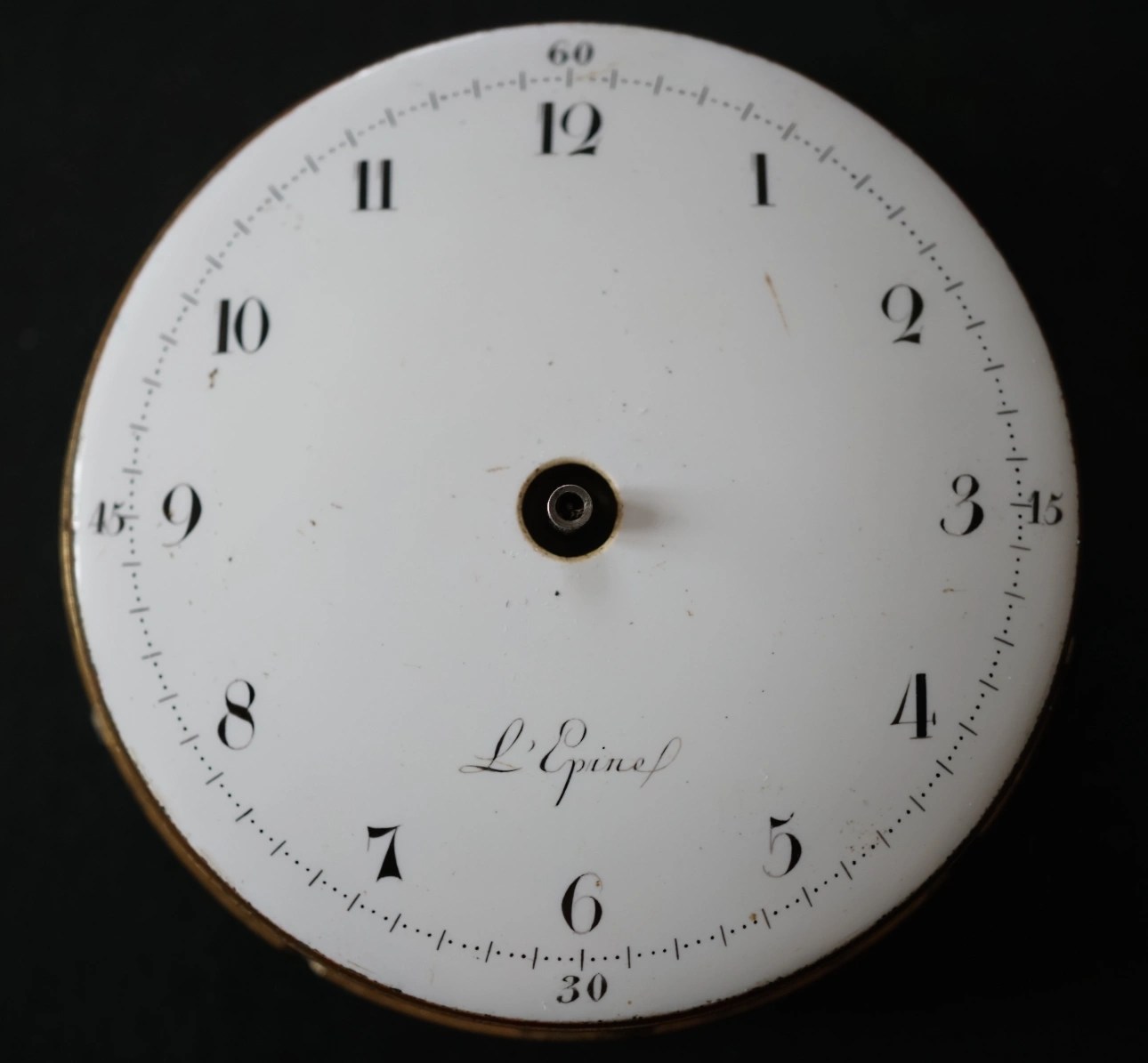 Description: Gilt brass, back wound, movement with virgule escapement (45.4mm, diameter). Hanging barrel Lépine caliber with center seconds (second type with pierced bridge for second and third wheel). The movement lacks the typical two plate construction and represents the third type of the hanging barrel ‘Lépine caliber’, the spring barrel featuring a ‘circular’ spring. The ‘A,R’ on the balance bridge table, readable from the balance bridge foot side, as in the intermediate versions between 1775 and 1780. Enameled copper dial signed ‘L’Epine’, minutes subdivided in 5th. New type of hidden case spring and has a ‘cuvette’ (dust cap) with the usual engraved instructions and ‘Lépine No. 237’.