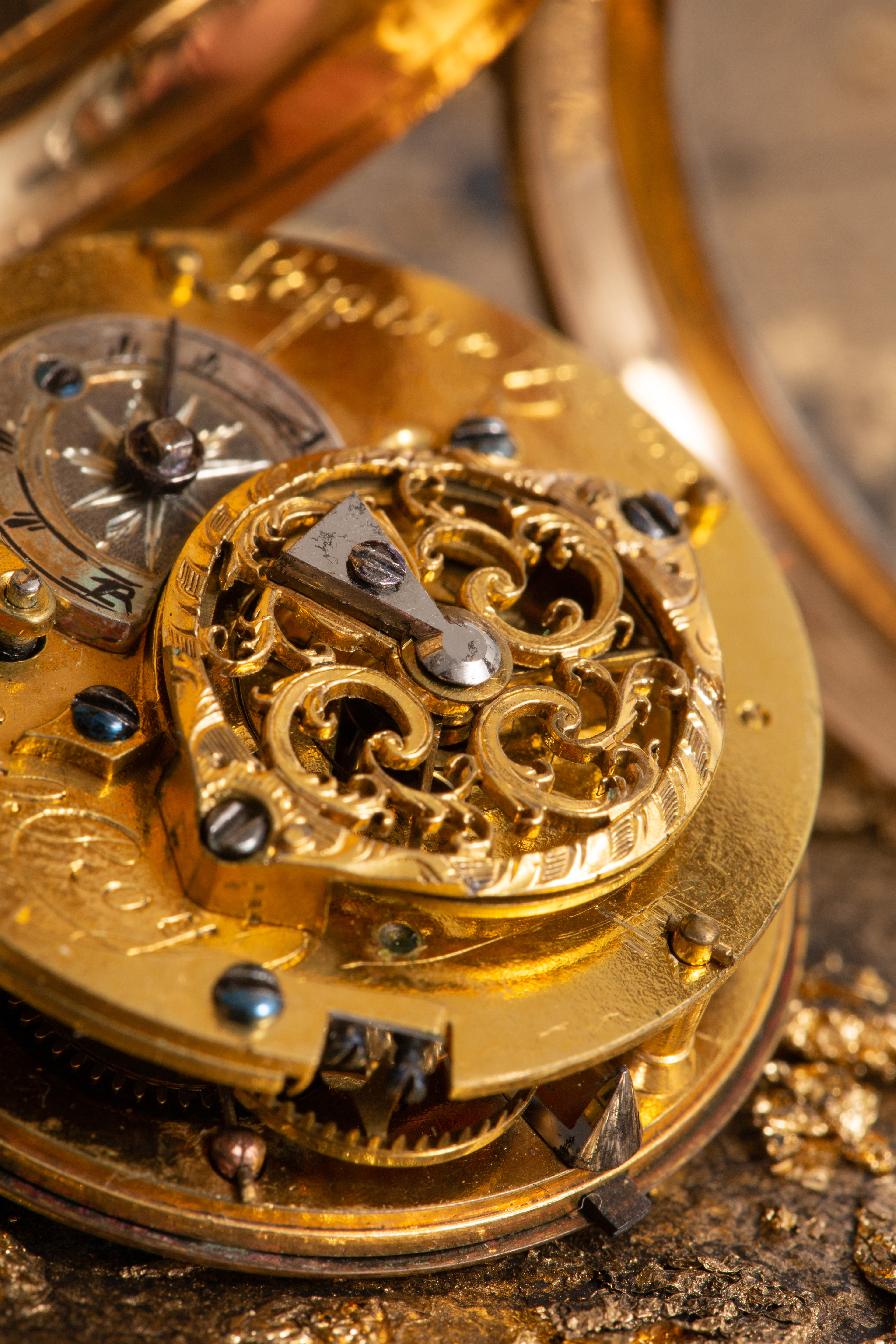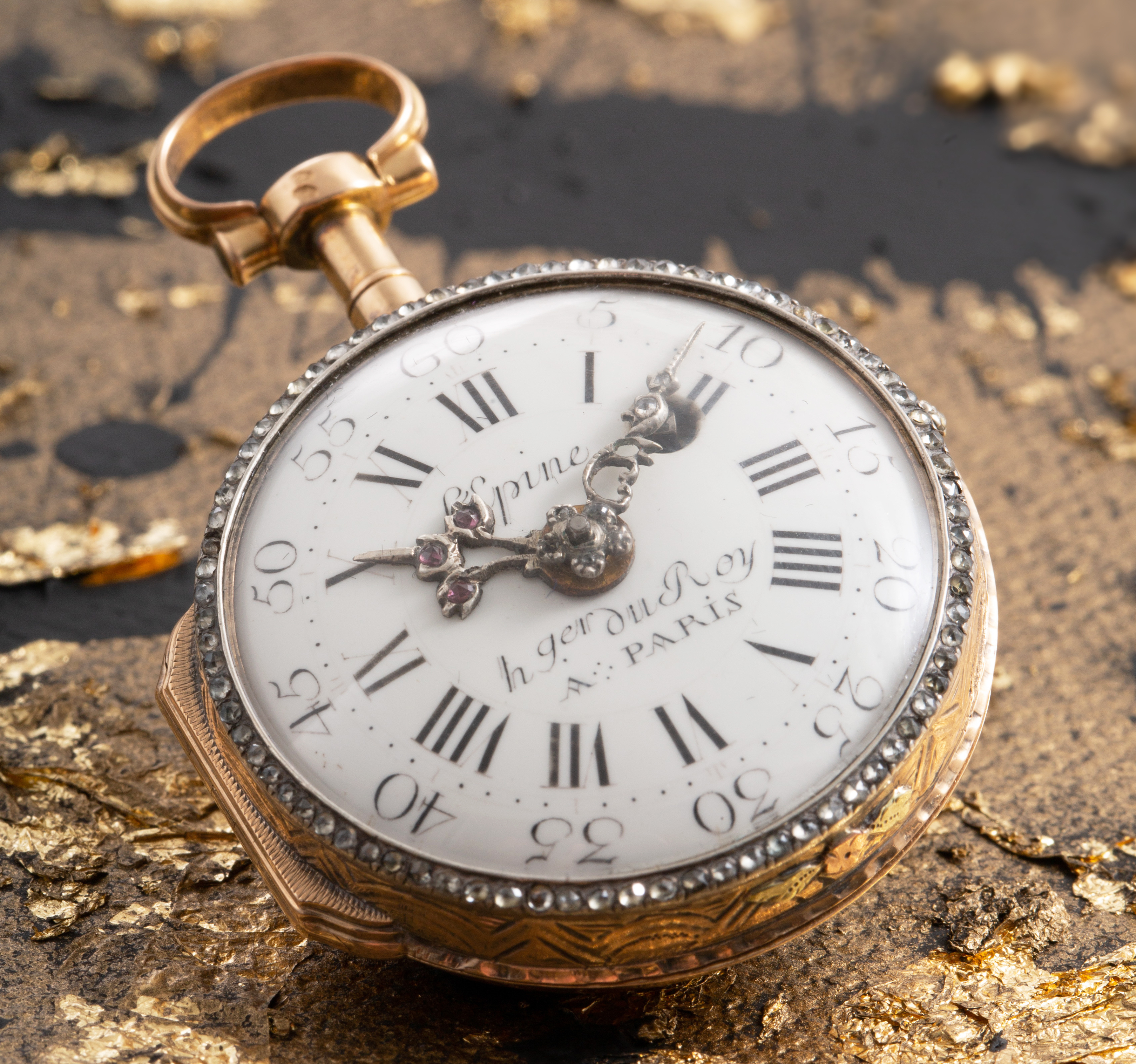 Description: Gold consular case (33.0mm), containing a gilt brass, front wound, verge fusee movement. The case lid is surrounded by a silver rim containing diamonds, the rest is engraved with geometrical figures. Diamond catch button. The back of the case is decorated with multicolour gold (white, yellow, rose) leaves around an enamelled bezel with portrait of a lady. The bezel is surrounded by a silver rim and surmounted by a silver bow tie shaped knot, all inserted with small diamonds. The type of colour scheme used for the enamelling is called ‘grisaille’ because of the monochrome aspect usually using shades of grey (here with purple background). Silver regulator dial and blued steel regulator hand, quite small two-footed cock with steel cockerel. Round pillars, enameled copper dial with Roman and Arabic numerals. The dial is signed ‘L’Epine h(orlo)ger du Roy à Paris’. Silvered brass hour hand with rubies, shaped like a ‘Fleur de Lys’, minute hand with diamonds.