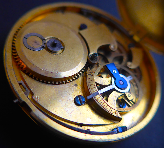 Description: Gilt brass, back wound, movement with steel cylinder escapement (46mm diameter), hanging barrel Lépine caliber (A). The movement lacks the typical two plate construction and represents the third type of the hanging barrel ‘Lépine caliber’, the spring barrel featuring a ‘circular’ spring. The ‘A,R’ on the balance bridge table, readable from the balance bridge foot side, as in the intermediate versions between 1775 and 1780. Later English enamelled copper dial. The movement also includes a new type of hidden case spring and has a ‘cuvette’ (dust cap) with the usual engraved instructions and ‘Lépine Invenit et Fecit’.
