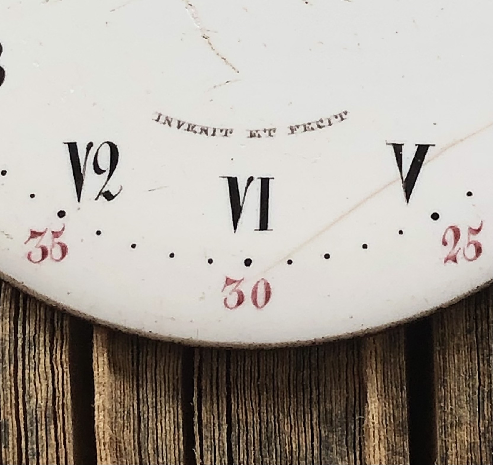 Description: Enamelled copper dial with Lépine’s late attempt for symmetrical numerals. Red Arabic 5-minute markers, black dots for minutes. ‘Inevnit et Fecit’ at ‘6’.