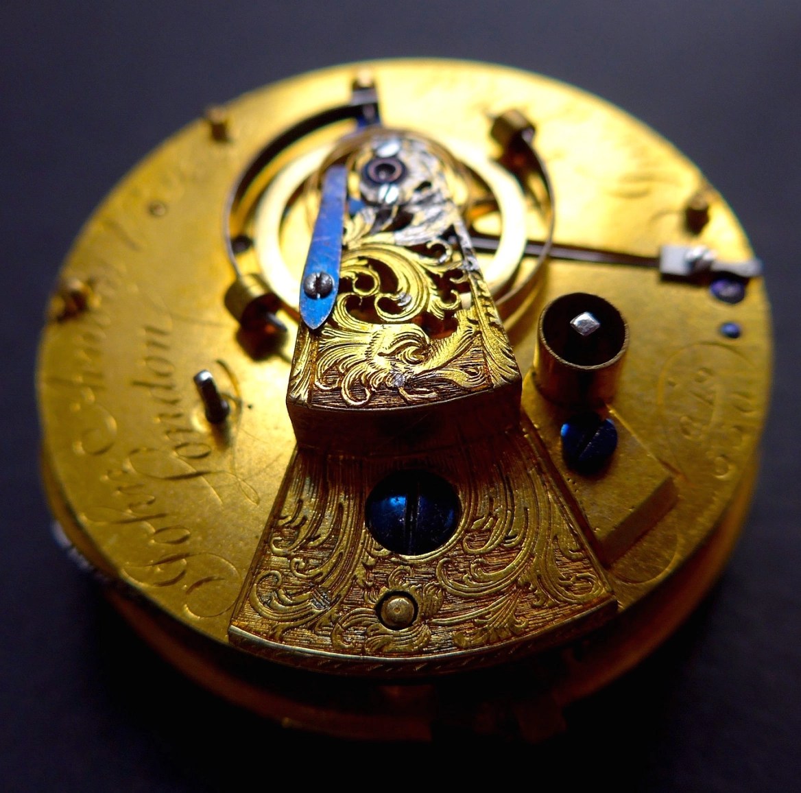 John Roger Arnold spent two years (1792 – 1793) as apprentice of Abraham – Louis Breguet in Paris. The movement dates from the year when John Roger returned from Paris. The style of his French master can be seen in the shape and finishing of the foot of the dust pipe around the winding square.