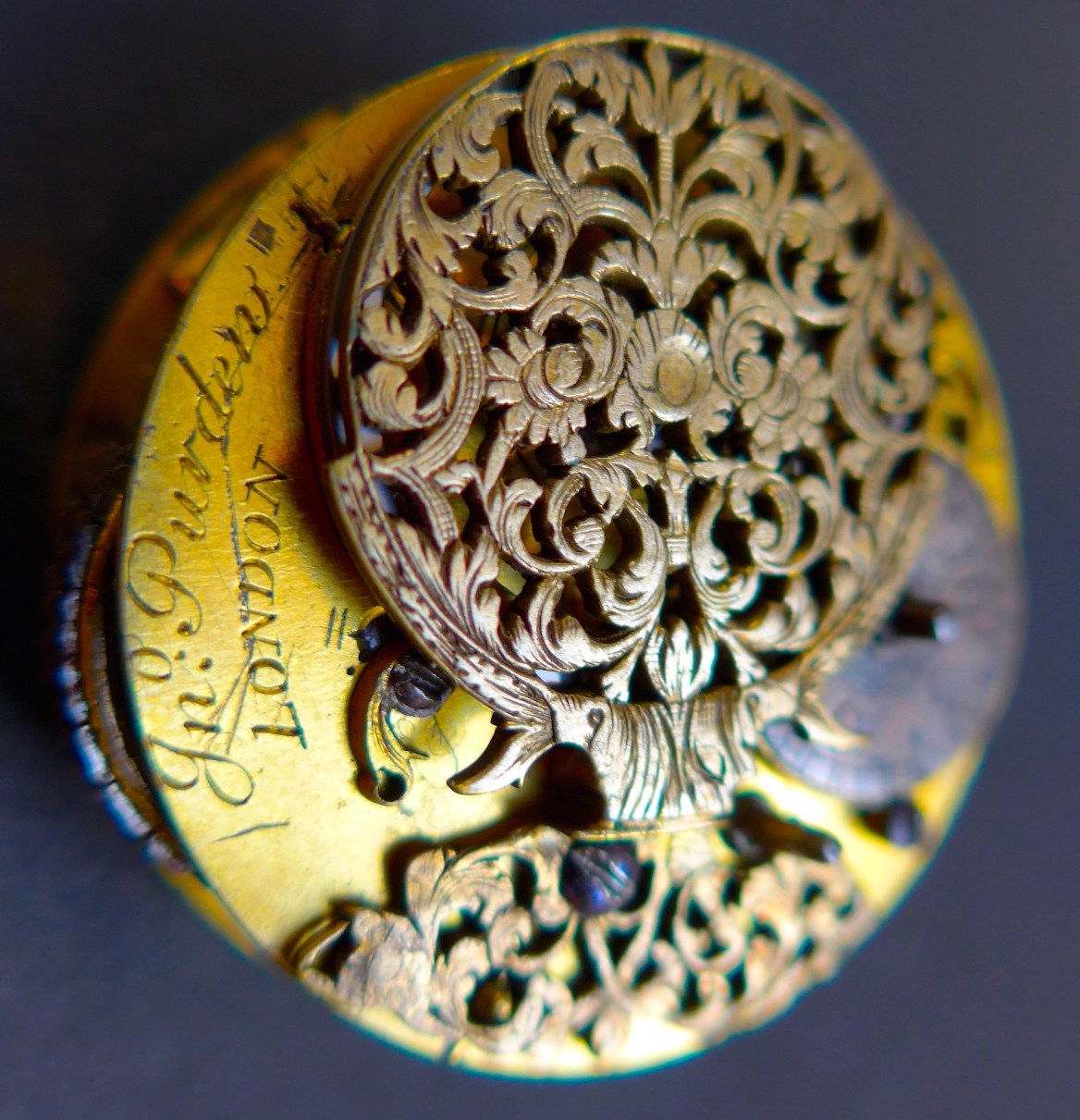 Description: Gilt brass, verge fusee movement (top plate 37.3mm, 8.8mm between plates) with Tompion regulator, cock-foot has not the D shape yet. Featuring Egyptian pillars, lacking dial plate, motion work, dial and hands.