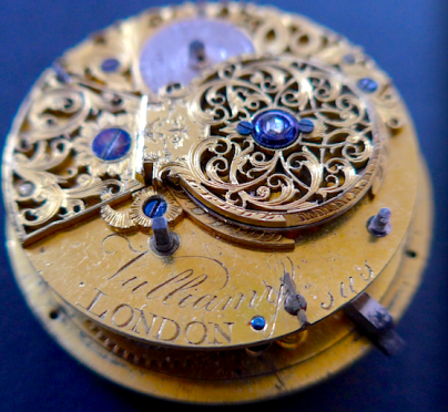 Description: Gilt brass cylinder movement (46mm diameter), 15 tooth brass escape, Graham-type banking. Cap jewels on balance and escape. Baluster pillars, steel balance and spiral balance spring. Later enamel dial. (A)