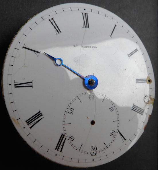 Description: Gilt brass, full plate, steel cylinder movement (47.5mm diameter). Brass three arm balance with blued steel balance spring. Balance held by a single bridge with steel cockerel holding a sapphire end stone. Fusee with Harrison’s maintaining power. Long steel regulator hand, regulator index engraved onto the backplate. Backplate engraved ‘Louis Berthoud A PARIS, No. 2520’. The movement has been modified at manufacture from a hinged system to an unhinged system for casing. Enamelled copper dial with Roman numerals and seconds subdial at 6 o’clock. Dial signed ‘L(oui)s BERTHOUD’ at 12. Blued steel hour hand of early, flat ‘Breguet’ style. Lacking Minute and second hand.