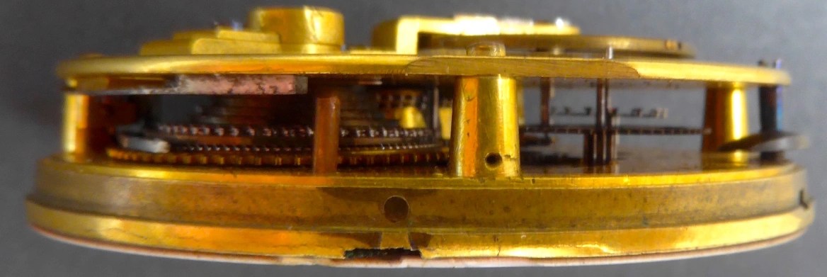 A rare survivor of Louis Berthoud’s simple watch movements. He was mostly responsible for the manufacture of pocket and and later of marine chronometers. Interestingly this watch has one of George Harrison’s most widely adopted innovations for pocket watches in England: Harrison’s maintaining power. This is the only French watch known to us which includes this feature.