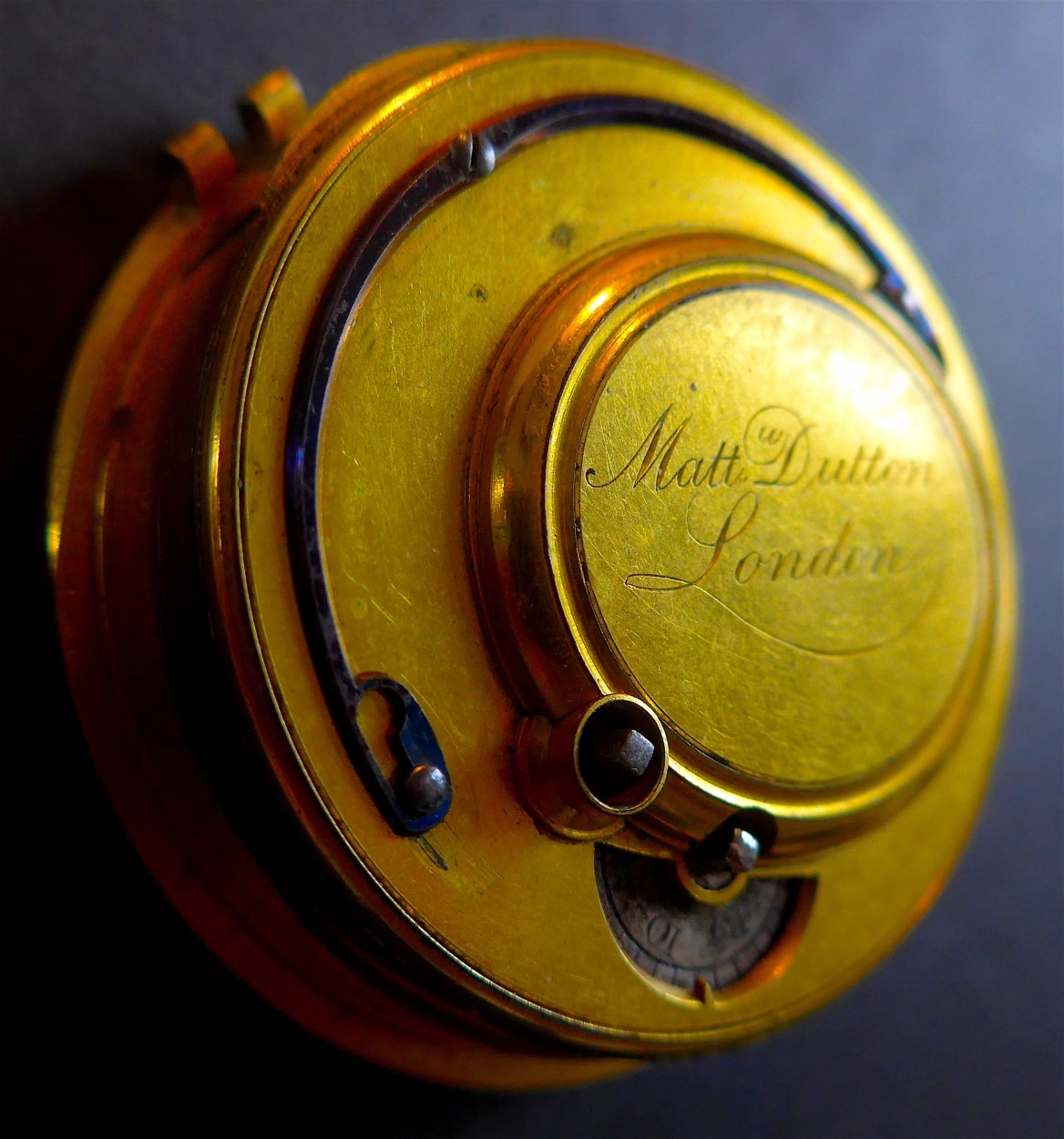 Elder son of William Dutton. The layout and construction of this movement respects almost all traditions of manufacture of George Graham and perfectioned by Thomas Mudge. Matthew, the son of Matthew will later use Lancashire style raw movements (see below). One of very few known movements by this maker. (A)