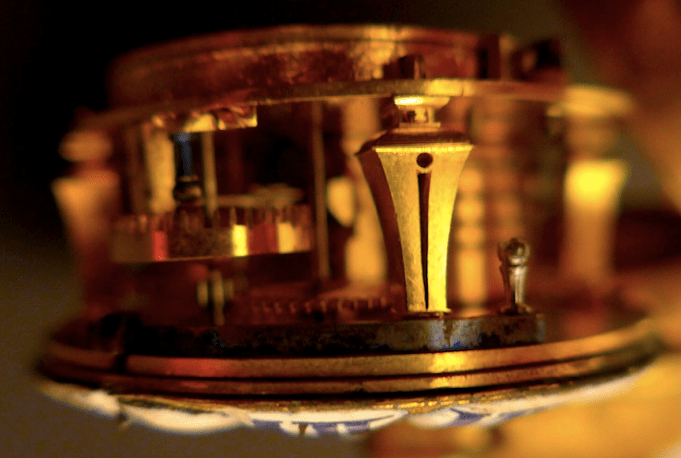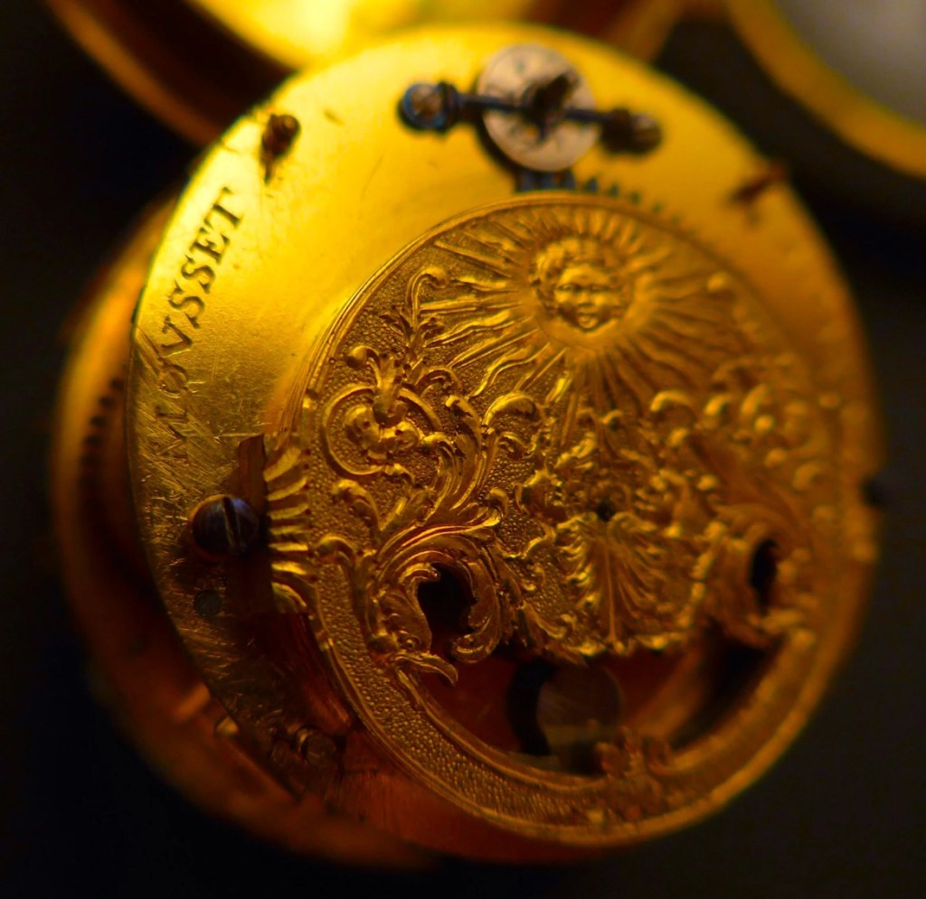 Description: Gilt brass consular cased (case 55.9mm) watch (ognion) with gilt brass, verge fusee movement with small regulator, two footed cock with big diameter (30.9mm) showing pseudo pendule of the three armed, steel balance (Mock pendulum). Back plate signed ‘MOVSSET A PARIS’. Featuring Egyptian pillars, gilt copper, engraved dial with enamelled cartouches with dark blue painted roman numerals with one steel hand.