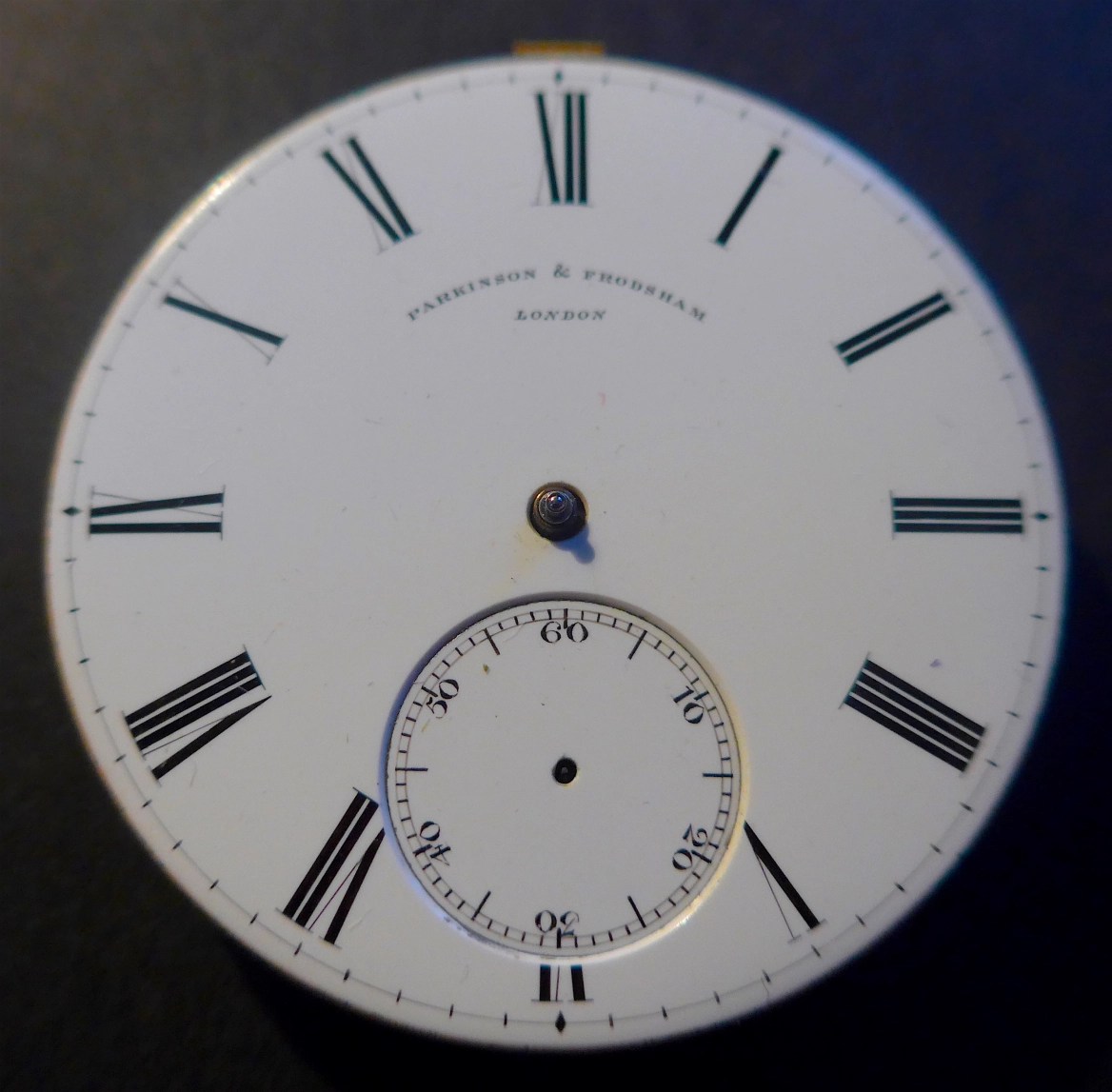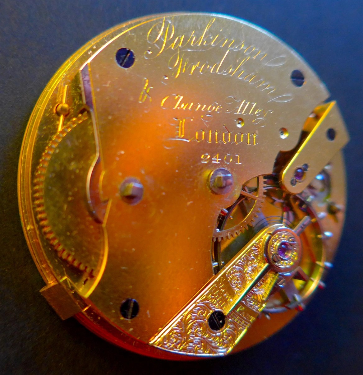 Description: Gilt brass, slim 2/3 plate pillar-less caliber, (42mm diameter). Single-roller detached lever escapement showing distinct Swiss or French influence. Polished steel club-tooth escape and large exposed ruby pallets, roller with oval shaped jewelled pin. Compensation balance, spiral balance-spring. Perfect signed ‘Parkinson & Frodsham London’ enamelled copper dial with sunk seconds at 6. (A)