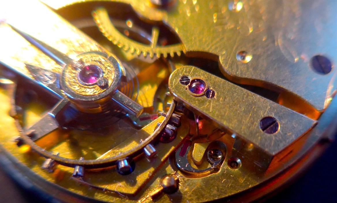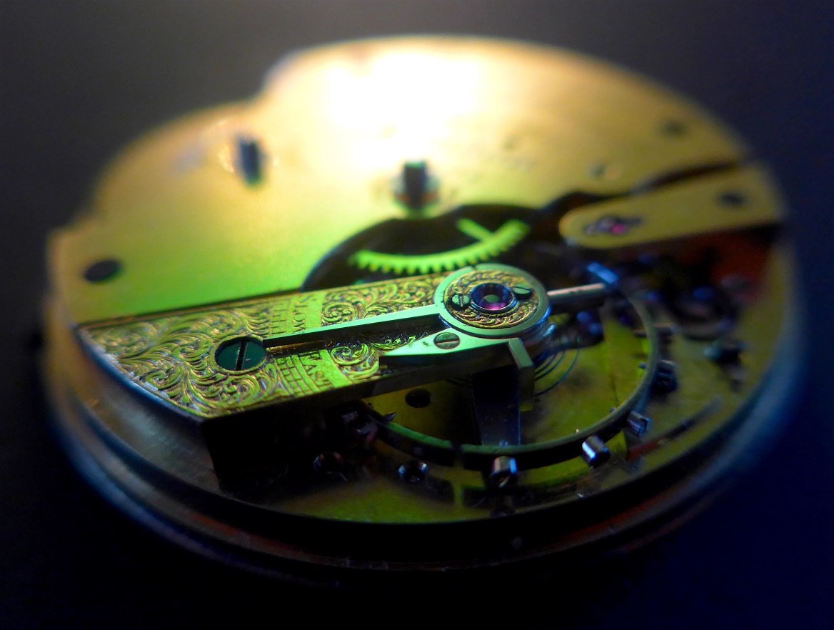 This movement shows many aesthetic and mechanical parallels to the pieces made by the ‘British Watch & Clockmaking Company’. The unusual lever escapement most probably has been made by an expatriated Swiss or French watchmaker (A). Sylvain Mairet who spent several years in London working for many well known watchmakers such as Benjamin Vulliamy and the Dent firm could be considered the most probable (A).