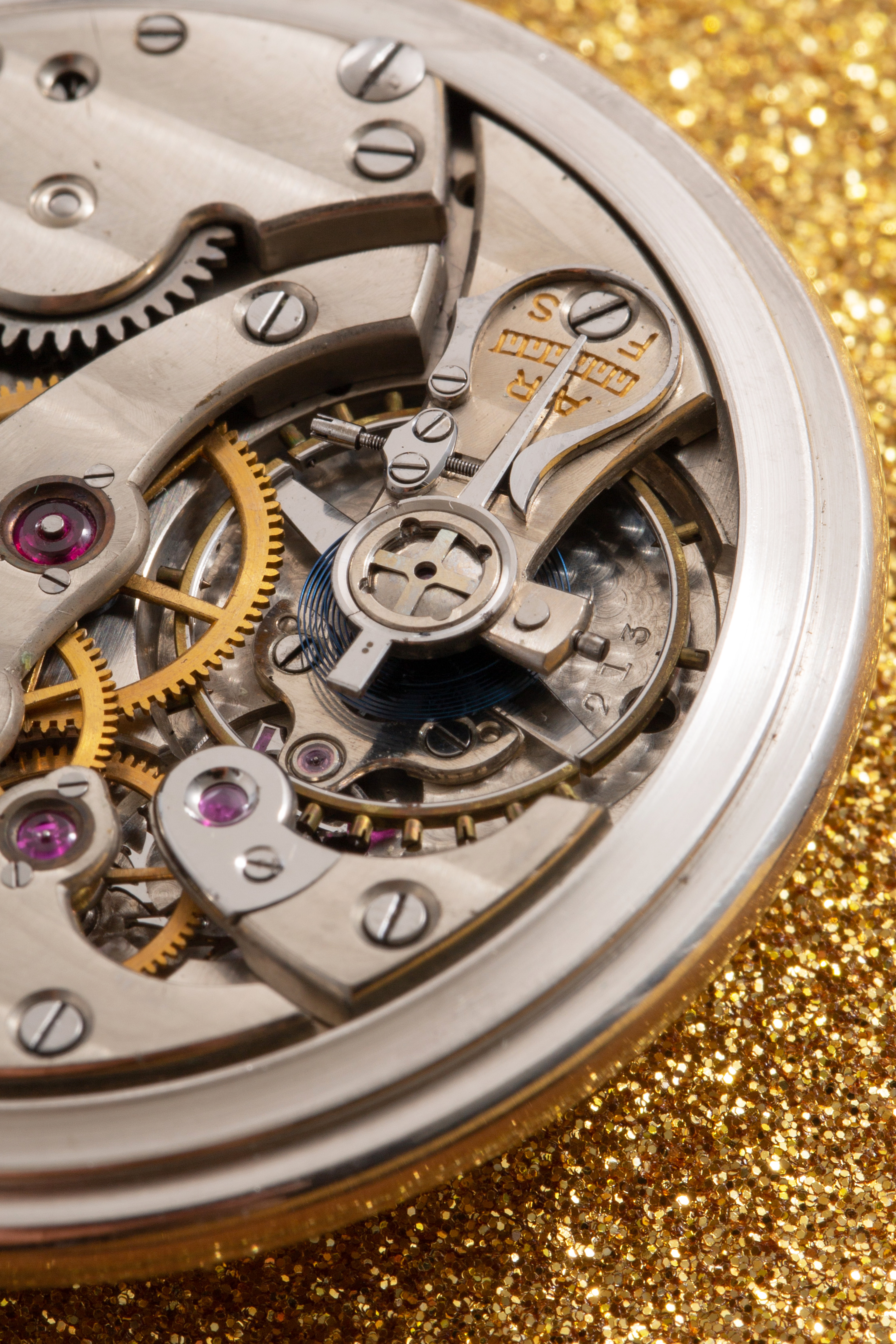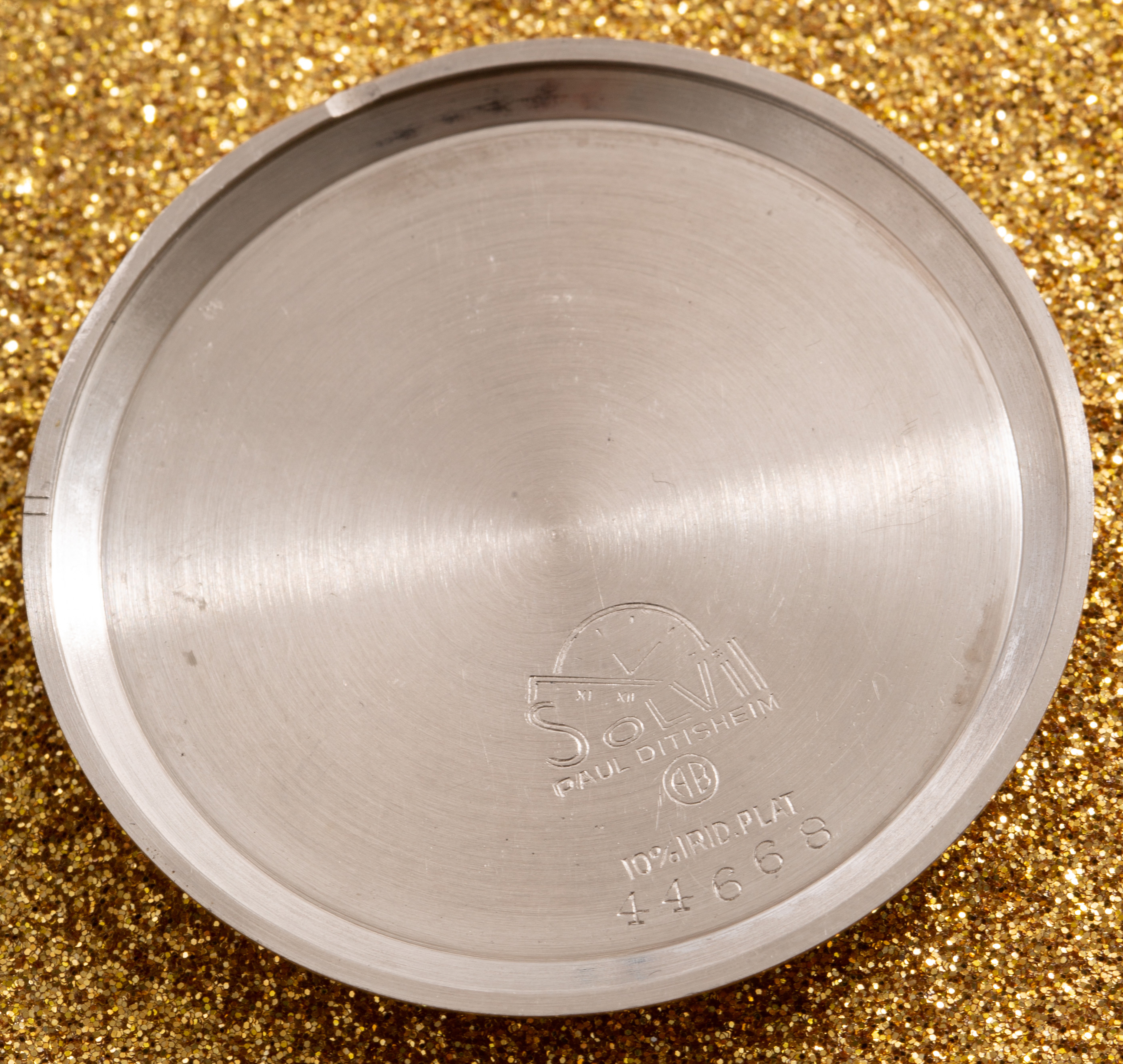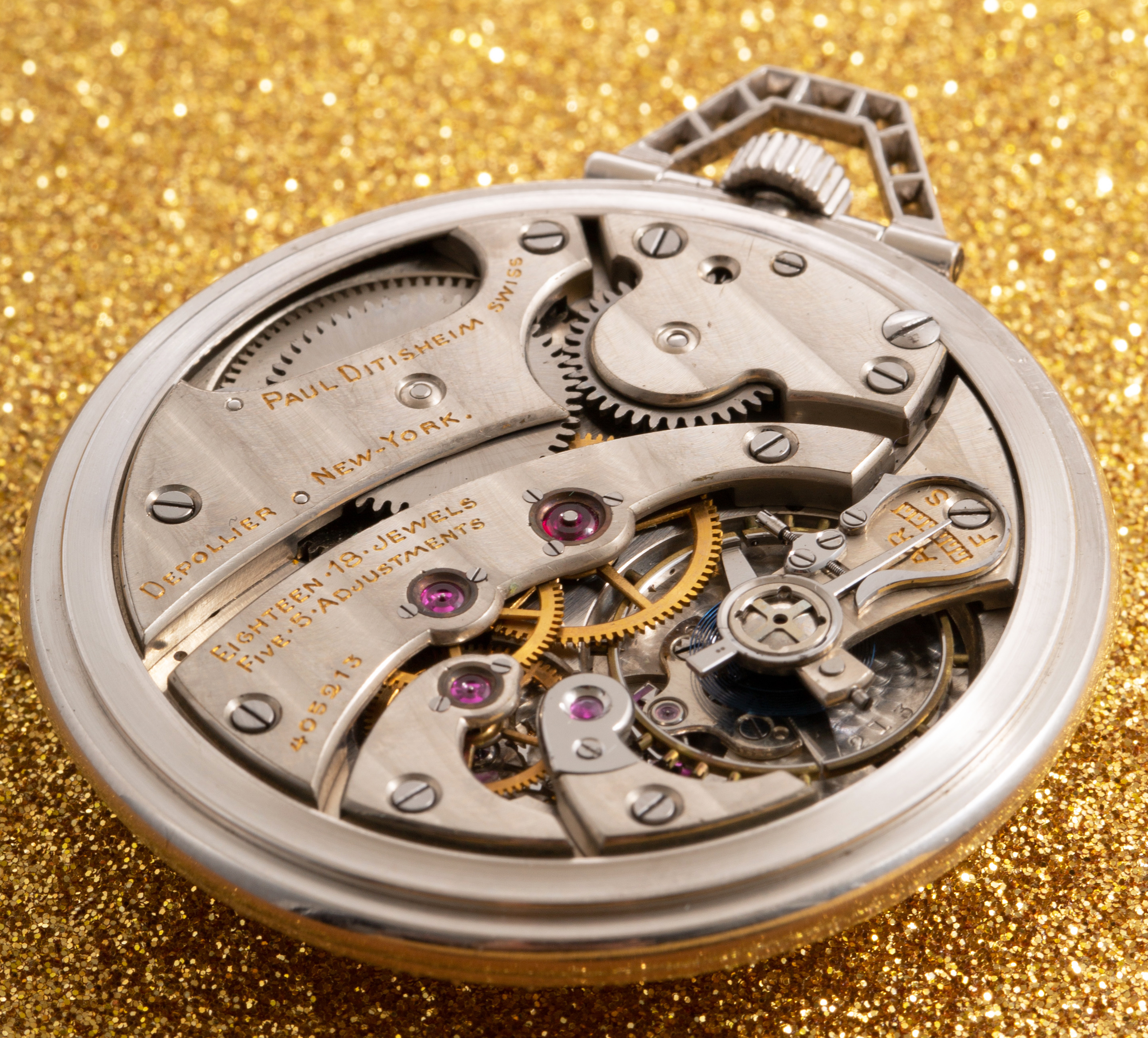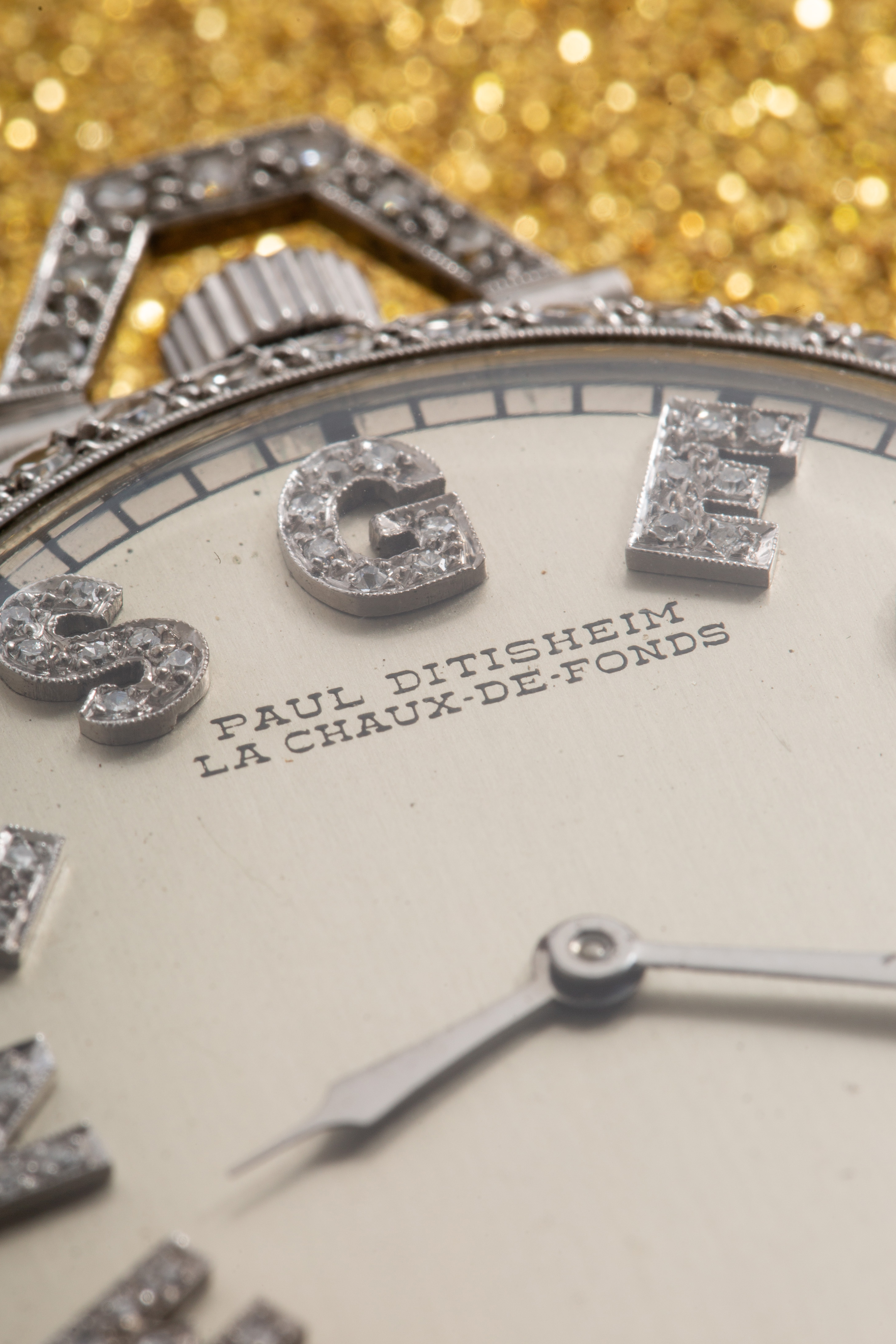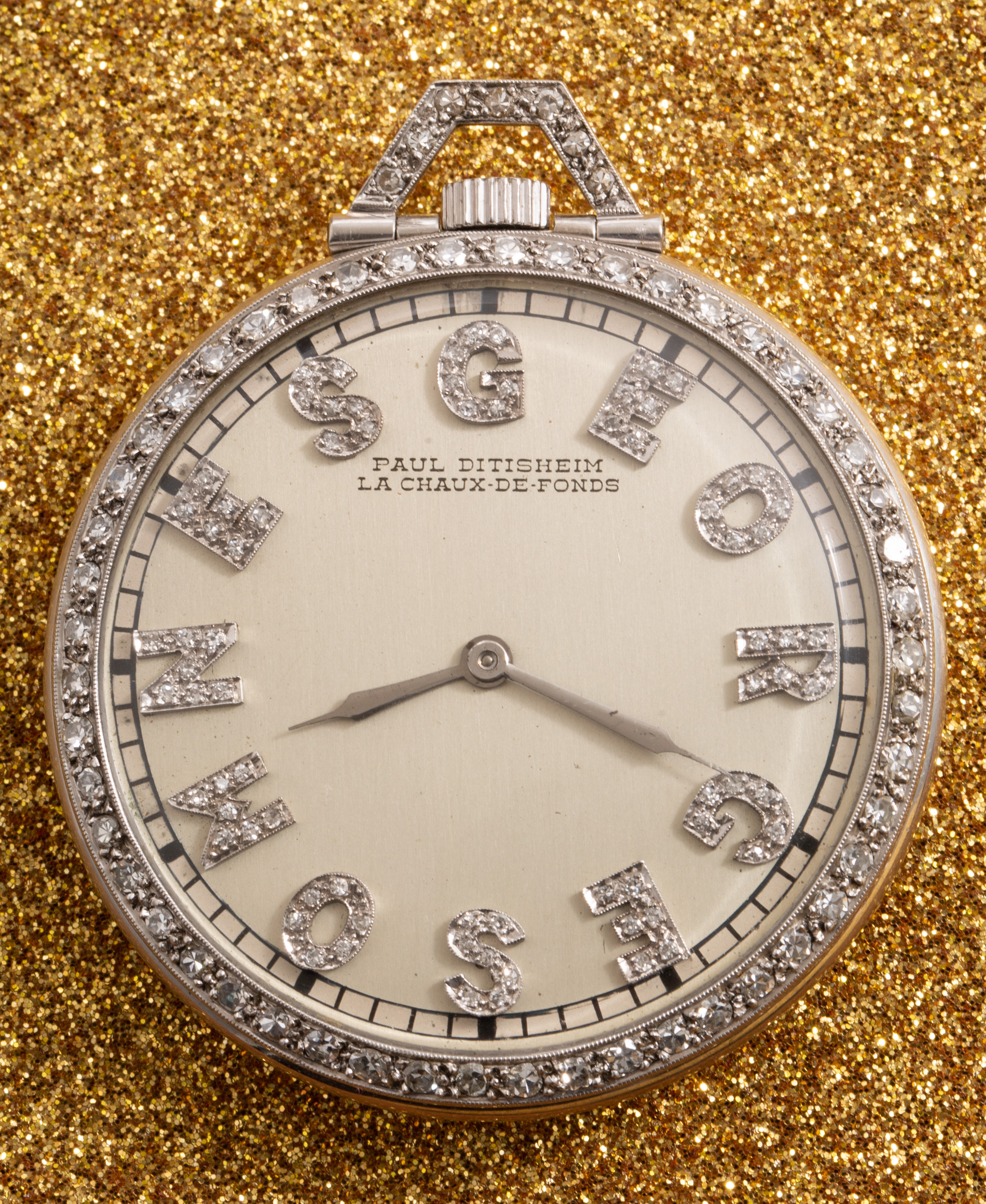 Description: Platinum cased super slim pocket watch. Bezel set with brilliant cut diamonds. Plain platinum snap back, inside marked with company info, case number ‘44668’ and case material declaration. Two tone white/silver dial with vertical brushing, engraved and black enamelled railway minute track, black printed company info underneath ’12’. Hour markers set with brilliant cut encrusted, platinum letters forming ‘GEORGE SOMNES’. White metal spade hands, no second hand. Very high quality movement with swan neck regulator and compensation balance, movement decorated with ‘Geneva stripes’. Movement engraved with ‘Paul Ditisheim’, ‘Depollier New York’, ‘5 adjustments’ and production number ‘405913’.