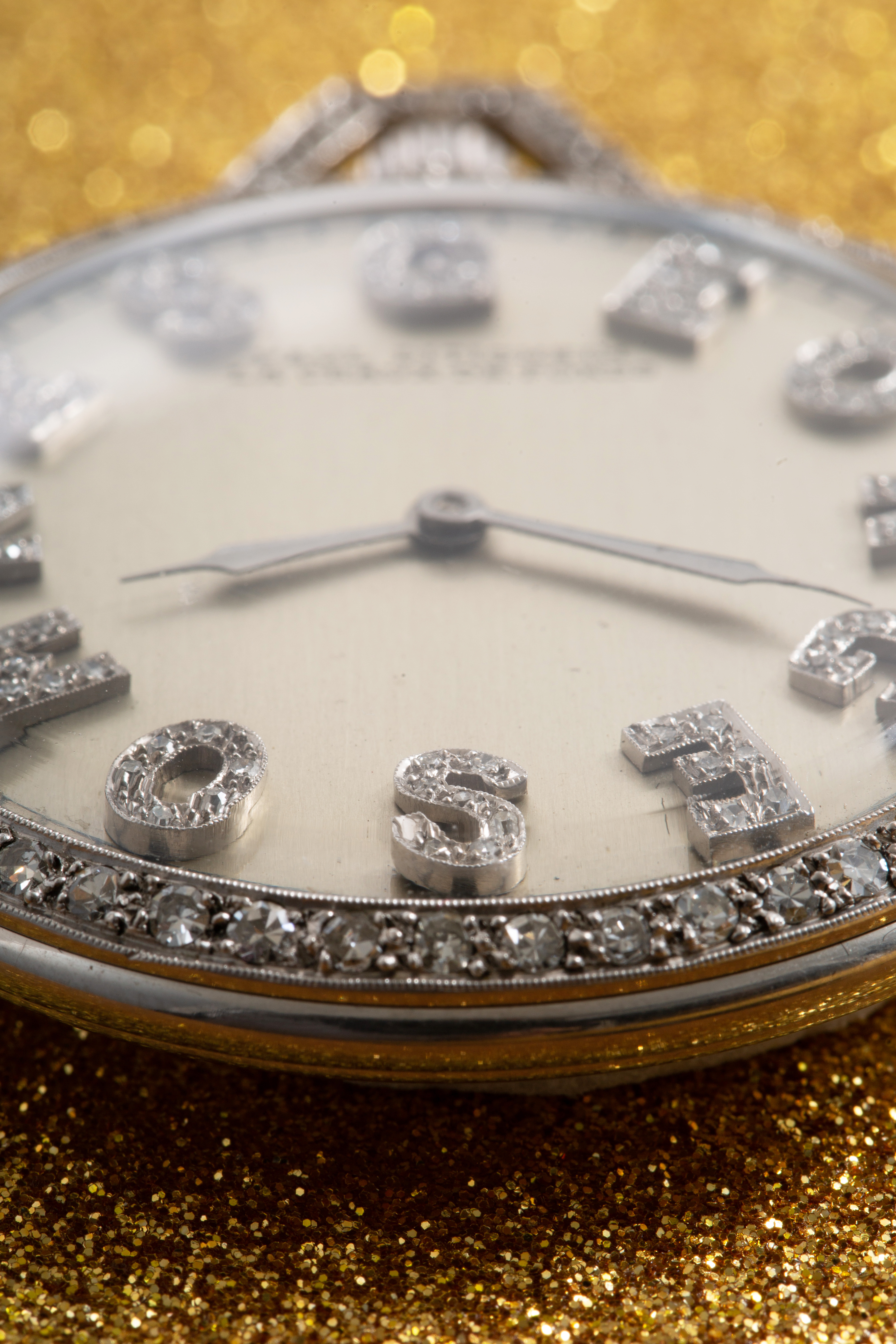 The watch was build in Switzerland, including the platinum case and imported by Charles Depollier in New York. The watch was a special commission for George Somnes, as indicates the ‘name dial’. The style of the manufacture of the platinum letters is contemporary to the manufacture of the bezel as are the treatment of the diamonds.