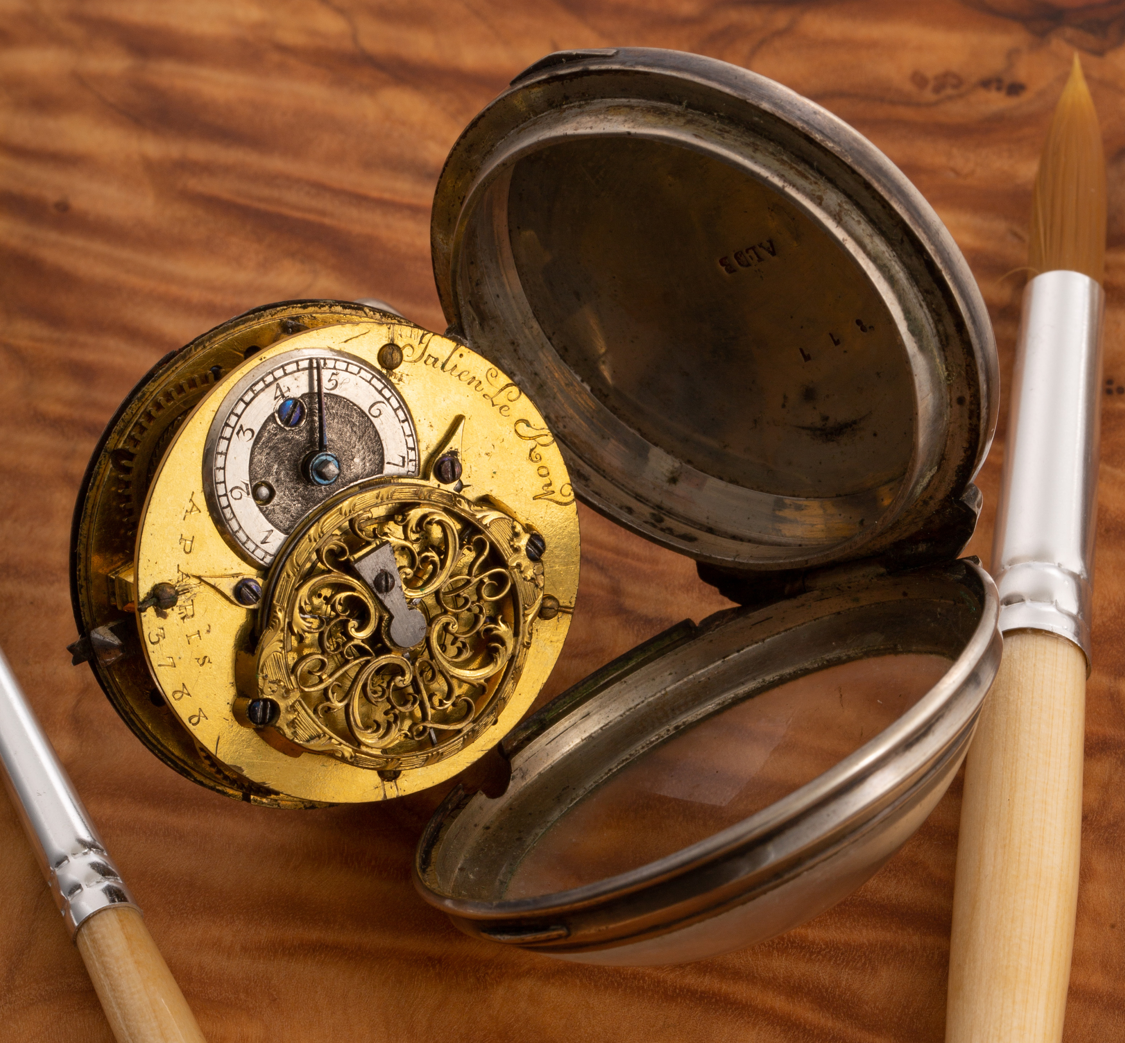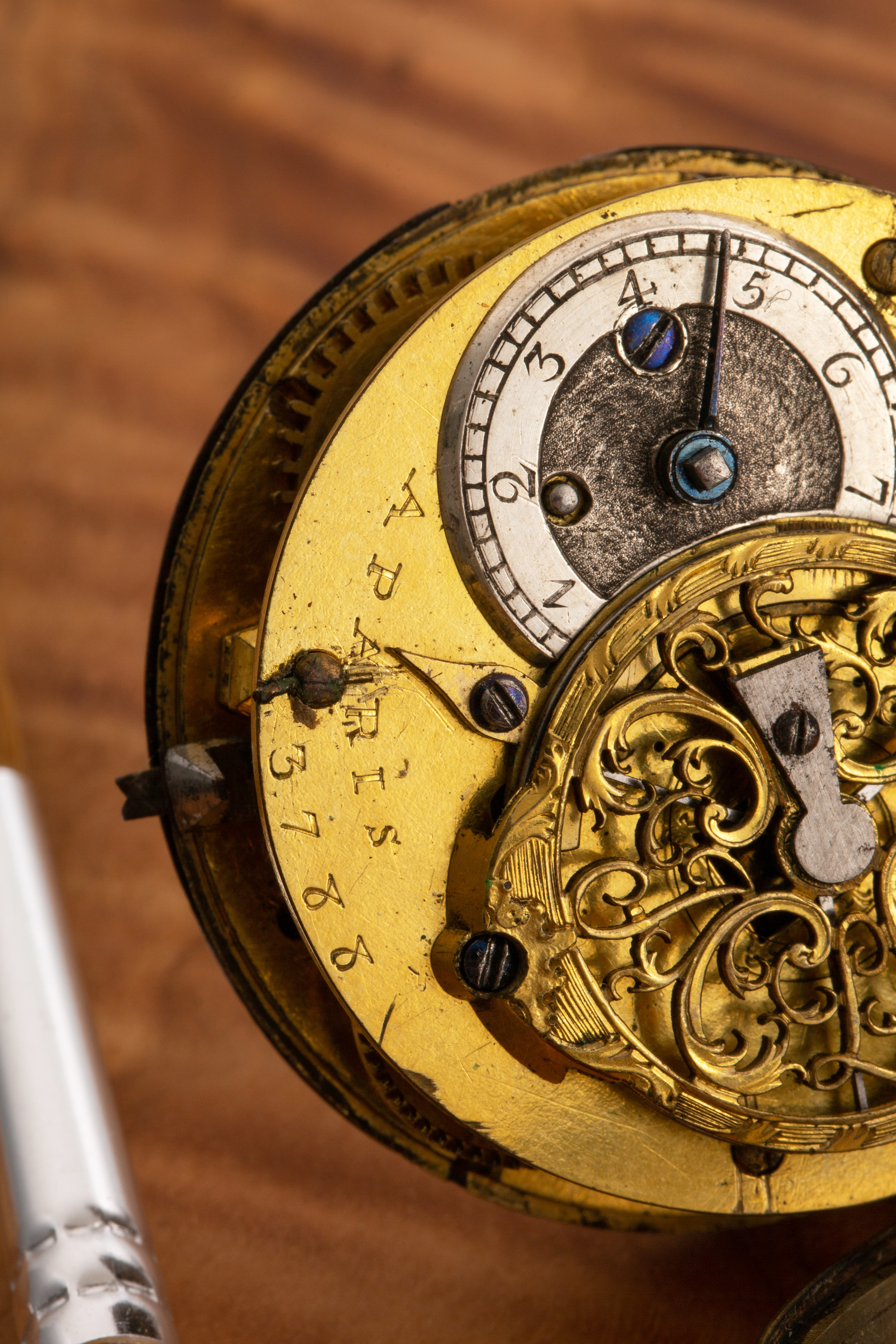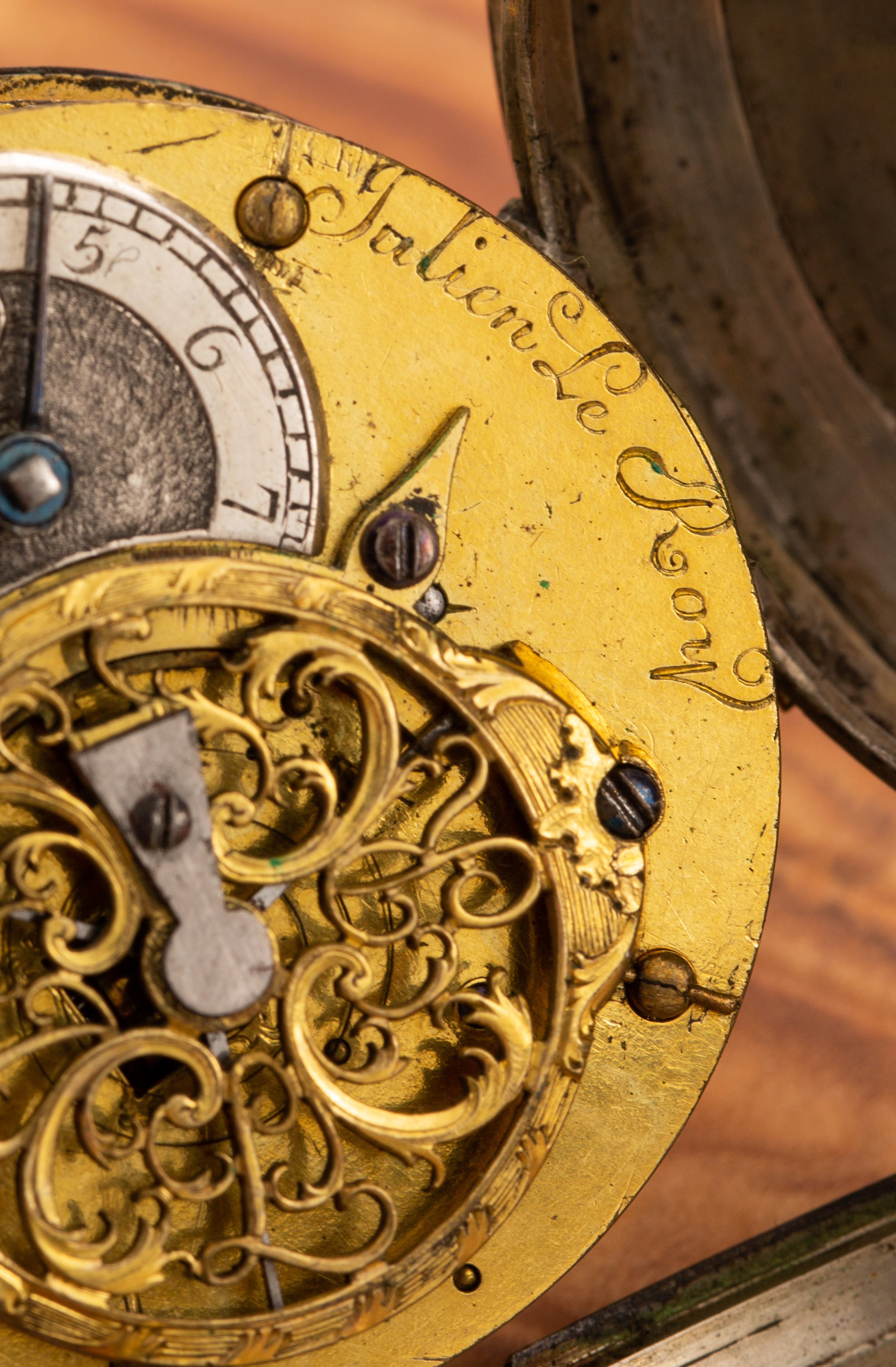 Description: Gilt brass, verge fusee movement with inverted fusee in later silver consular case. Three armed balance with steel balance spring, small gilt brass cock bearing Julien Le Roy`s initials `JLR` intricately fitted between the scroll work of the cock, back plate signed ‘Julien Le Roy’ honouring Pierre’s father and numbered ‘3788’ back plate signed ‘Julien Le Roy’ honouring Pierre’s father. The production number dating the movement after Julien Le Roy’s death as described above. Small baluster pillars. Later unsigned enamelled copper dial.