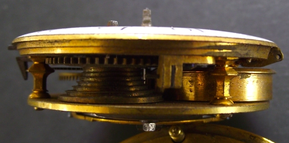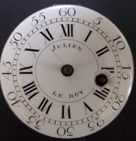 Description: Gilt brass, verge fusee movement with inverted fusee. Three armed balance with steel balance spring, small gilt brass cock, back plate signed ‘Julien Le Roy’ honoring Pierre’s father and numbered ‘4389’. The production number dating the movement definitively after Julien Le Roy’s death as described above. Small square baluster pillars. Enameled copper dial signed ‘Julien Le Roy’.