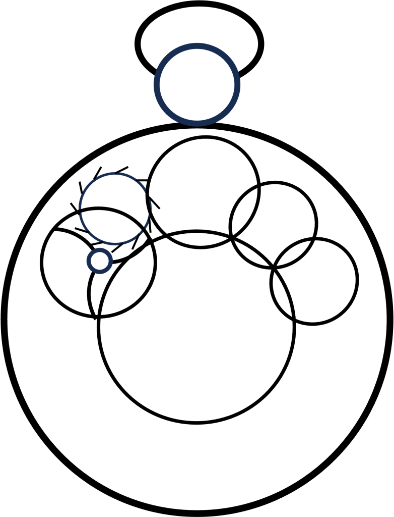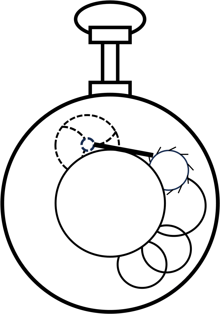 The ‘montre à tact’ or ‘tactile watch’ is an ingenious invention by Breguet made in 1799. Without the need of reinventing much of the movement arrangement, just by transferring the wheel work onto an arbor on the back side of the movement he could have the main arbor activate a big hand on the outside of the case and the auxiliary arbor acting on normal hands on a smaller dial. The smaller dial can also lack. The rotation of the big hand can be felt in ones pocket and compared to protruding indicators on the rim of the case, for the most luxurious models made of big diamonds or pearls. This way it is possible to estimate the time quite precisely without the need of getting the watch out of the pocket or to rely on potentially disturbing chimes of a repeating watch.