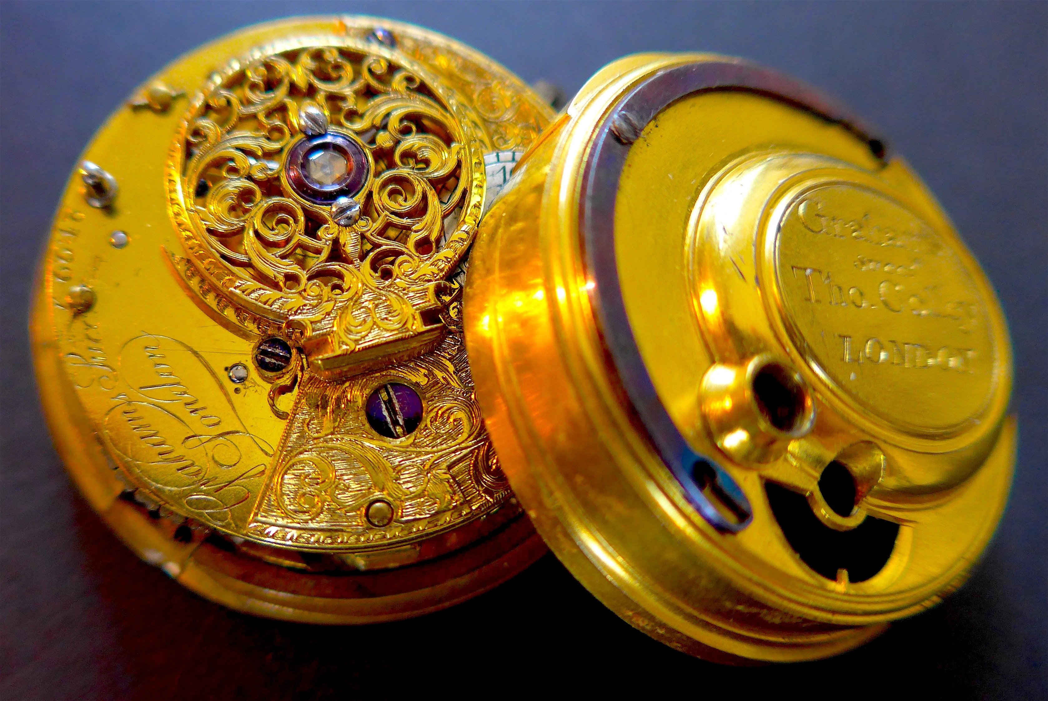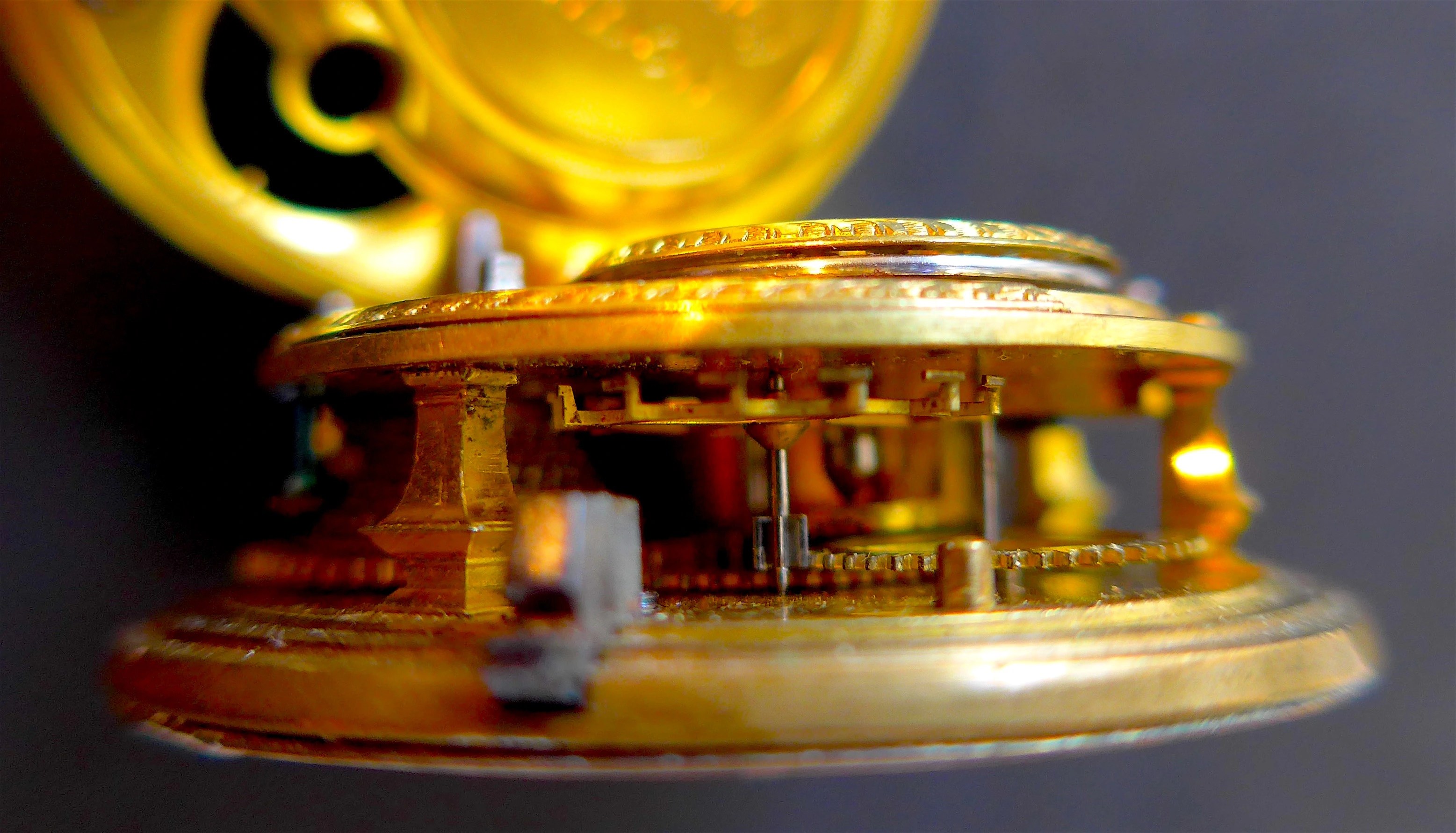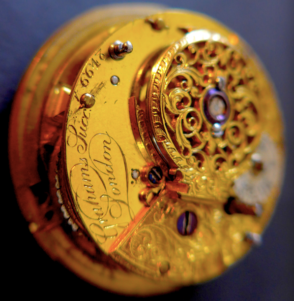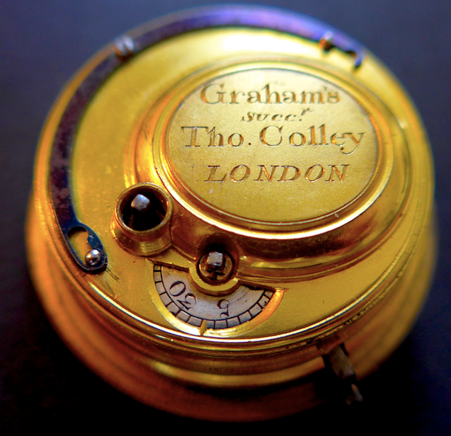 Description: Capped, gilt brass, full plate cylinder fusee movement (40mm diameter), cock with un-pierced foot and table with symmetrical engraving centred with a diamond endstone, movement number scratched inside the cap, a typical Graham workshop custom. Cylinder (dead-beat) escapement retaining original Graham banking, brass escape with 13 teeth. Steel balance, 3-turn blued-steel balance-spring. Back plate engraved ‘Grahams Succ.(esso)r London 6648’. Cap engraved ‘Graham’s Succ.(esso)r Tho.(mas) Colley LONDON’. The movement later ‘enlarged’ with wider brass-edge and custom made white enamel dial. (A)