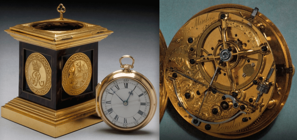 It has to be emphasised that this marine chronometer made in 1774 by Thomas Mudge remained the most precise timekeeper until 1887! (B)