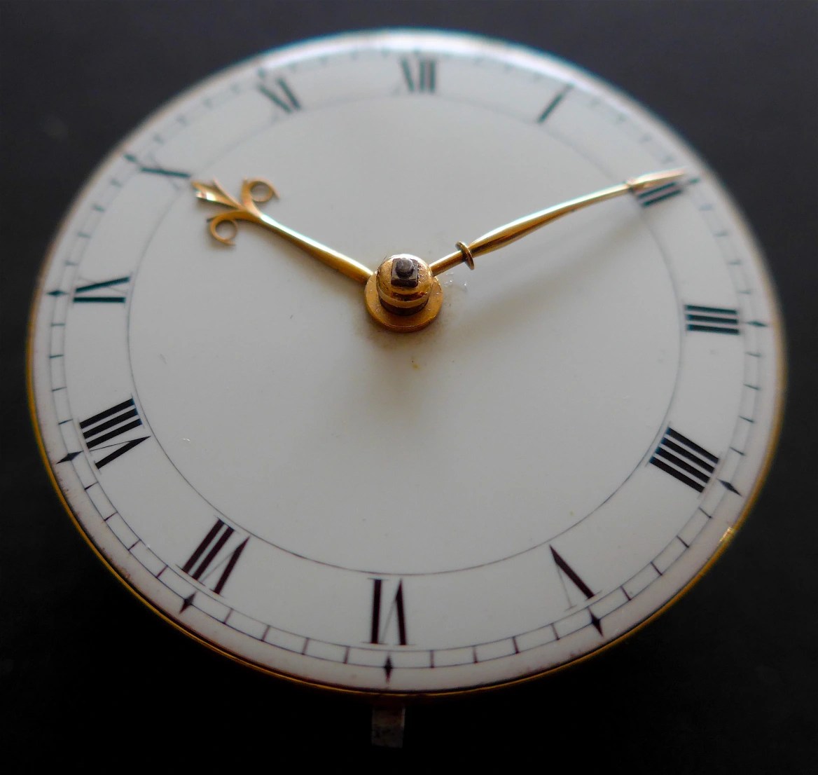 Description: Gilt brass, full plate fusee movement (46.5 mm diameter) with square baluster pillars and finely engraved balance cock. Diamond end stone. Signed back plate Tho(mas) Mudge W(illiam) Dutton London 1392’. Graham-type cylinder (deadbeat) escapement with original banking, brass escape with 13 teeth. Enamelled gold dial. Original gold, late type beetle and poker hands. Gilt brass cap signed ‘Tho(mas) Mudge W(illiam) Dutton London’, scratched with movement number ‘1392’ as per Graham workshop custom (A).