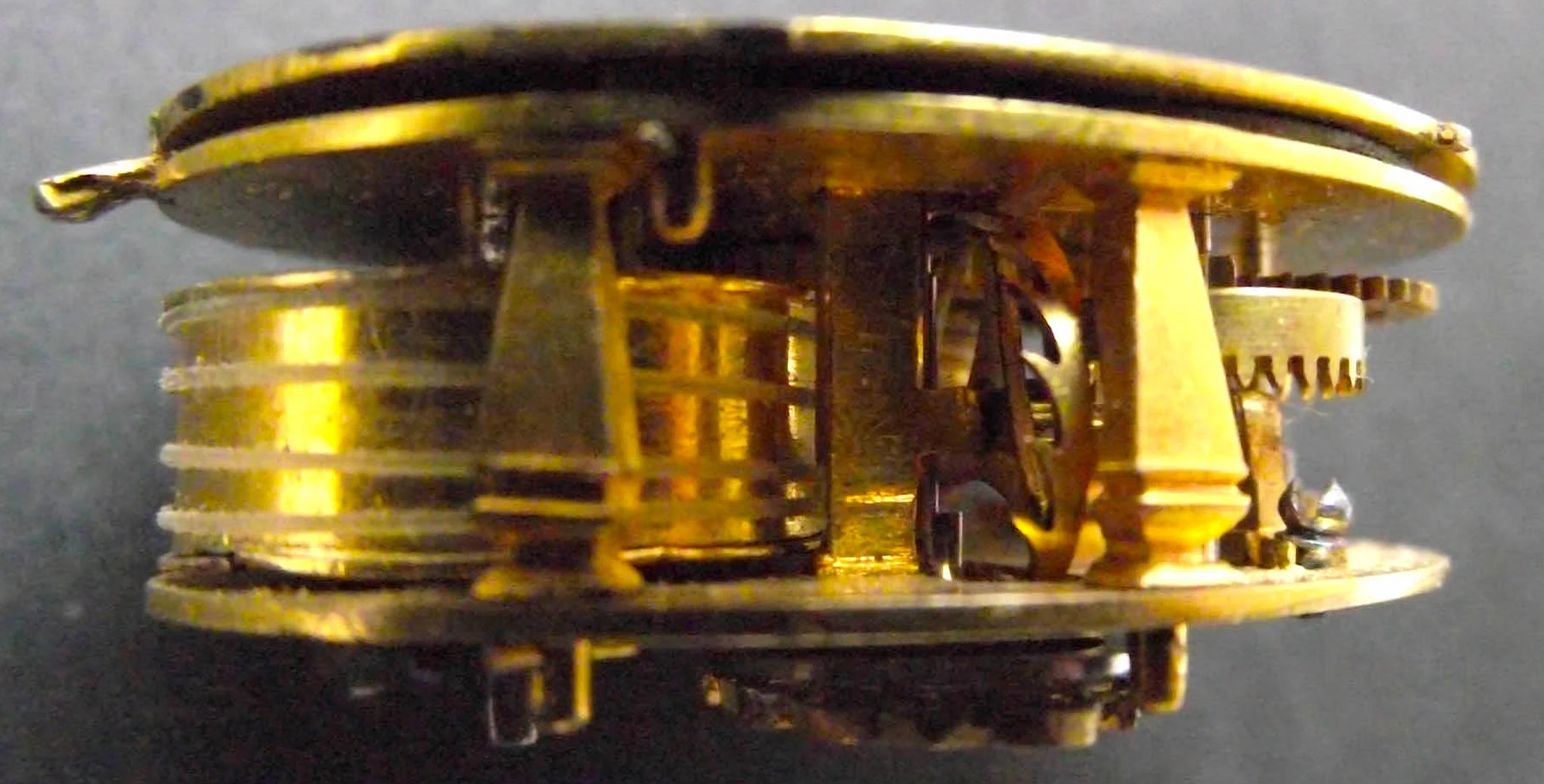 The verge movement was driven by a cord made with pigs intestine (now nylon), later (about 1650) this will be slowly replaced by a chain, which is more resistant.