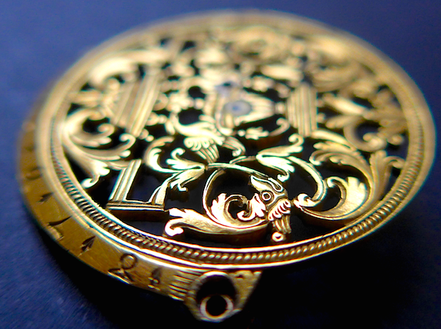 Description: French-style two footed cock (35.5mm max diameter, 37.7mm between attachment holes), decorated with symmetrical scrollwork, two dolphins, geometrical, architectural elements and urnes typical of the French Louis XIV style. The only feature giving it away as made in Geneva is the counter-clockwise scale for showing the tension of the balance spring (1 -8), which mechanism differed from the one used in France, being exclusively used in Geneva.